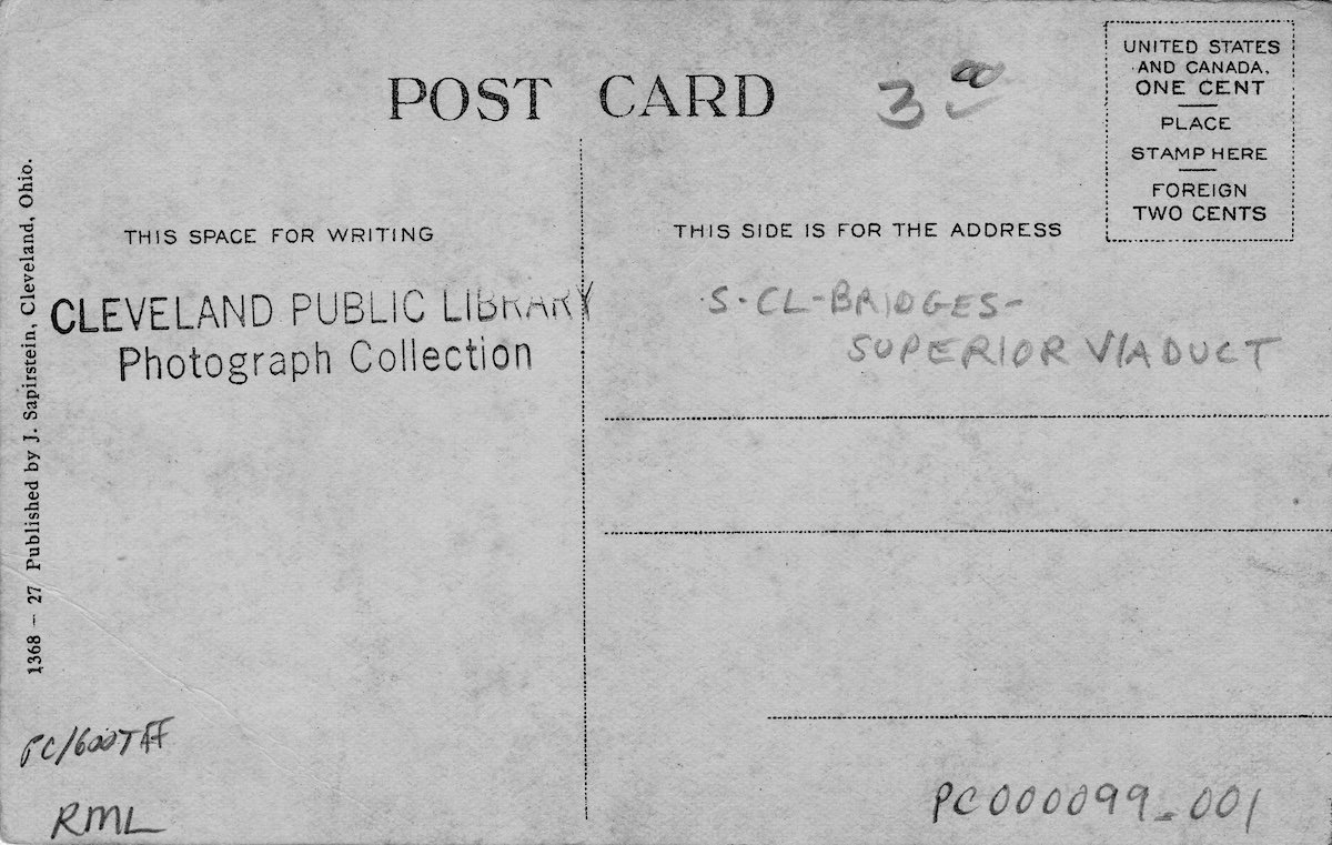 Note the stamp of "J. Sapirstein" on the left side of the back of the circa 1913 Superior Viaduct postcard. | Source: Cleveland Public Library, Digital Photograph CollectionDownload Original File
