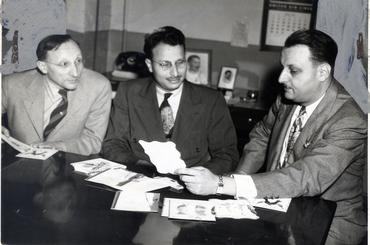 Jacob Sapirstein (left) discusses greeting cards with his sons Morris (middle) and Irving (right). The photo was taken in an American Greetings office at 1378 West 78th Street. | Date: 1945 | Source: Cleveland State University, Michael Schwartz Library, Special CollectionsDownload Original File