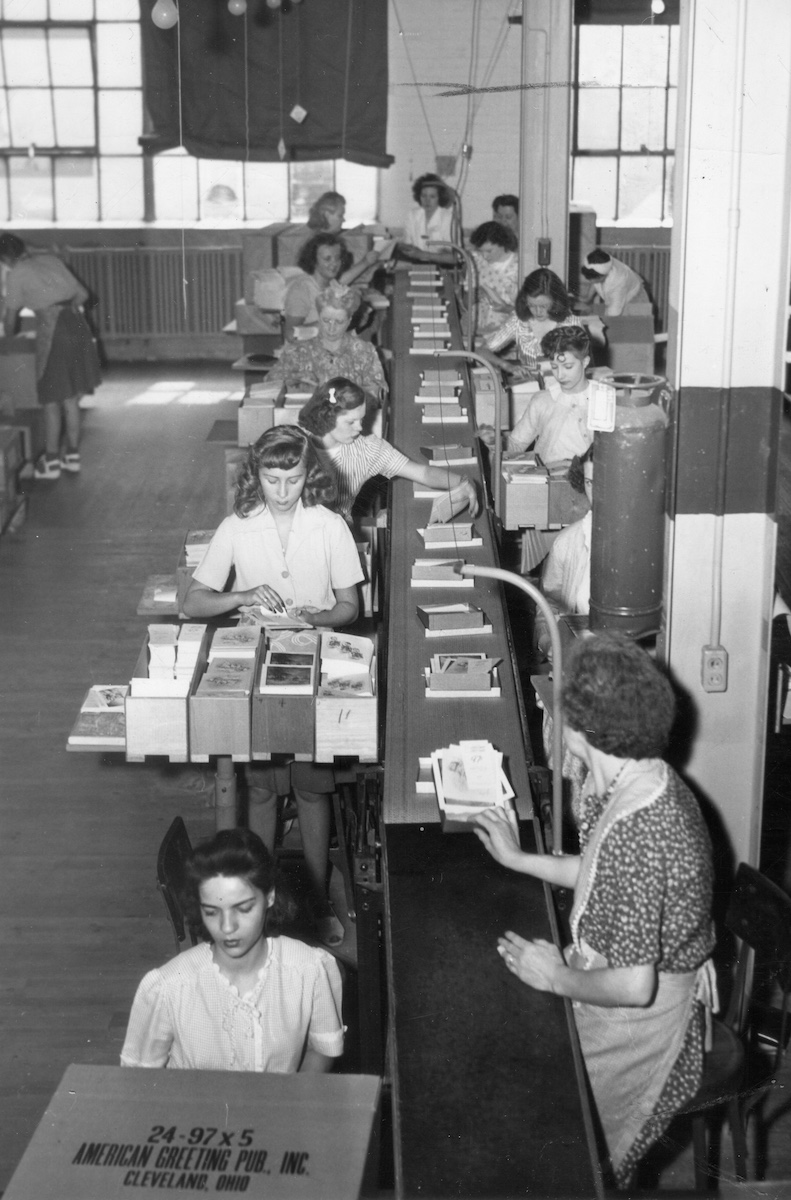 In this photo, American Greeting employees are seen boxing cards at the company's West 78th Street facility. | Date: 1945 | Source: Cleveland State University, Michael Schwartz Library, Special CollectionsDownload Original File