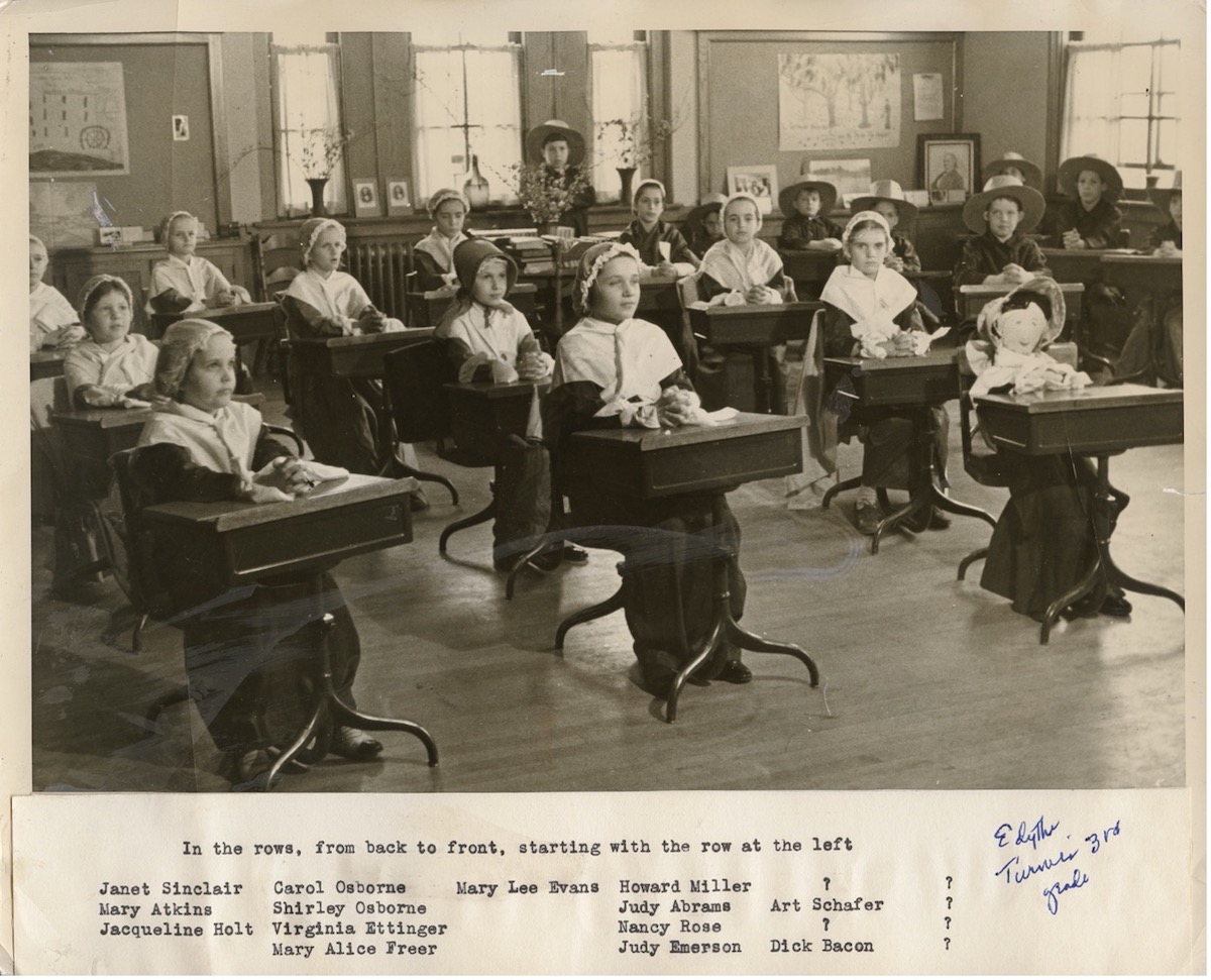 This photograph features Miss Edythe Turner’s third-grade class from Onaway School, who are dressed as Shakers for a play they presented. Teachers Miss Edythe Turner and Pearl Lee Stark led this project by gathering artifacts and promoting its popularity in the classroom. Their dedication ultimately resulted in the incorporation of this project into the permanent curriculum for future third-grade classes. In the photograph, the boys and girls are positioned on opposite sides of the room, reflecting the beliefs and practices of the Shaker community, which included the separation of the sexes. | Date: 1938 | Source: Elizabeth B. Nord Memorial Library and Archives, Shaker Historical Society.Download Original File