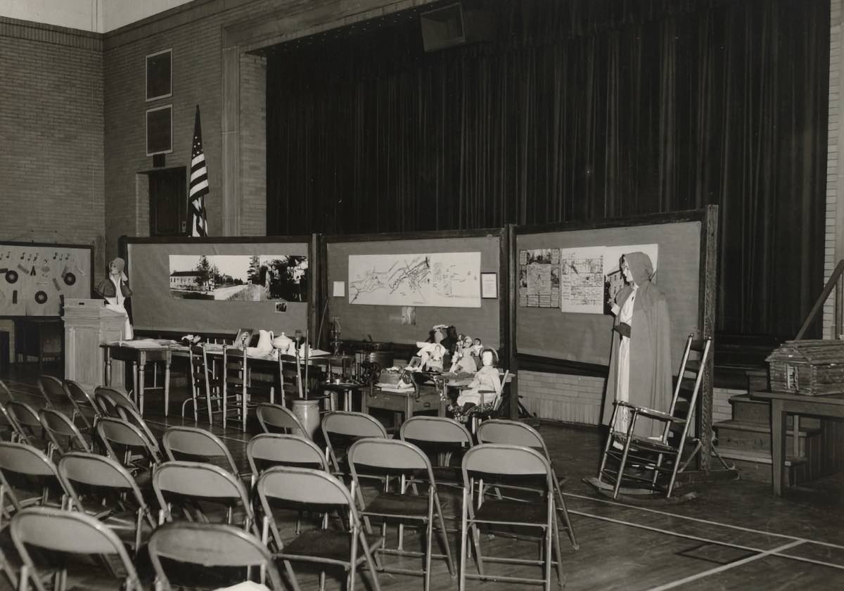 This photograph shows Frances Everhart’s exhibit as she prepares to present “The Museum Story.” At that time, the Shaker Historical Society was located in the Moreland School | Date: May 1, 1960 | Source: Elizabeth B. Nord Memorial Library and Archives, Shaker Historical SocietyDownload Original File