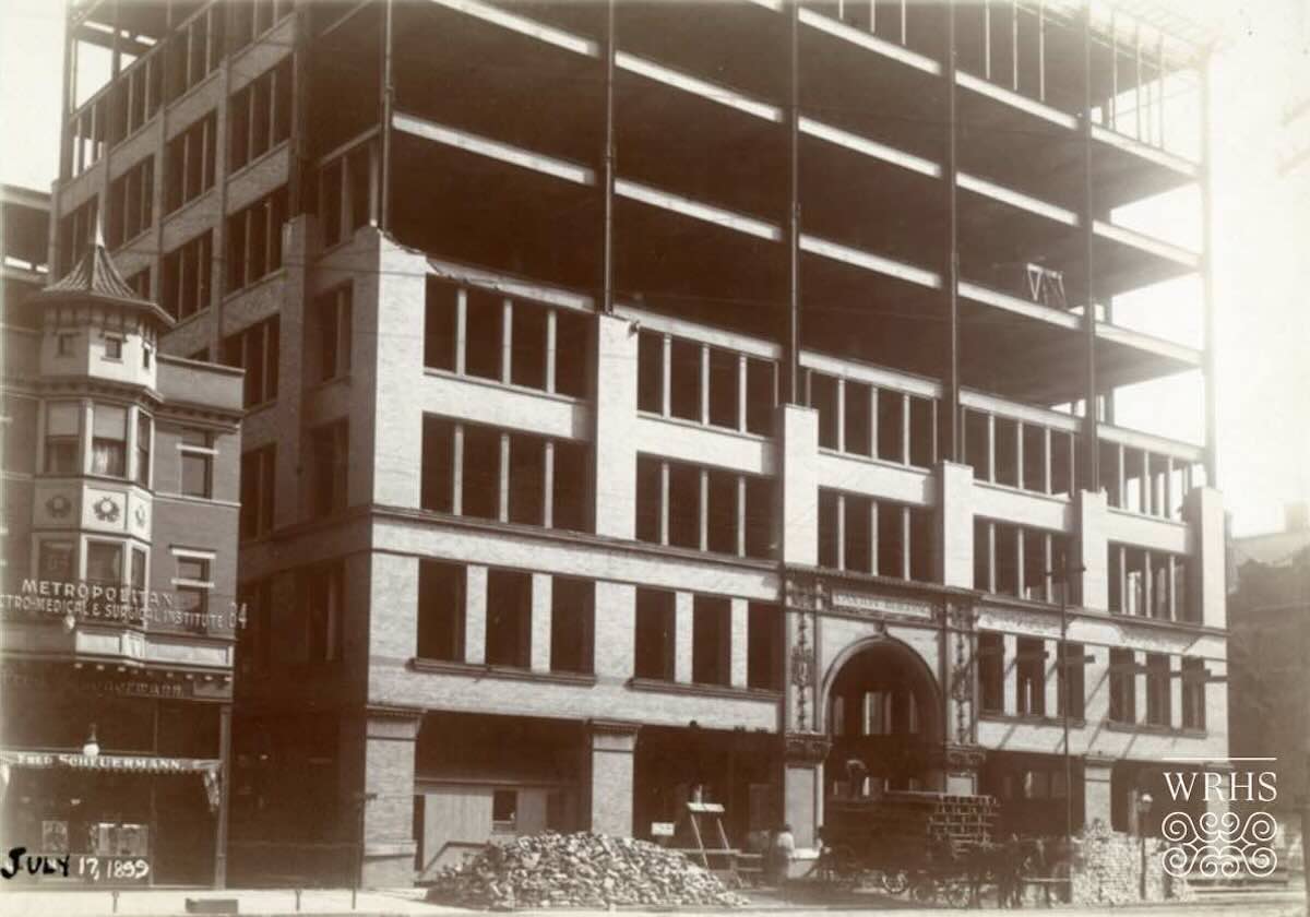 Street View of Building Under Construction ID: 12405 | This file appears in: Caxton Building The brick and terra-cotta face of the building had reached the fourth of its eight-floor steel structure by the time of this photo. | Date: July 17, 1899 | Source: Western Reserve Historical Society Download Original File SourceWestern Reserve Historical SocietyDateJuly 17, 1899 "Street View of Building Under Construction" appears in: Caxton Building