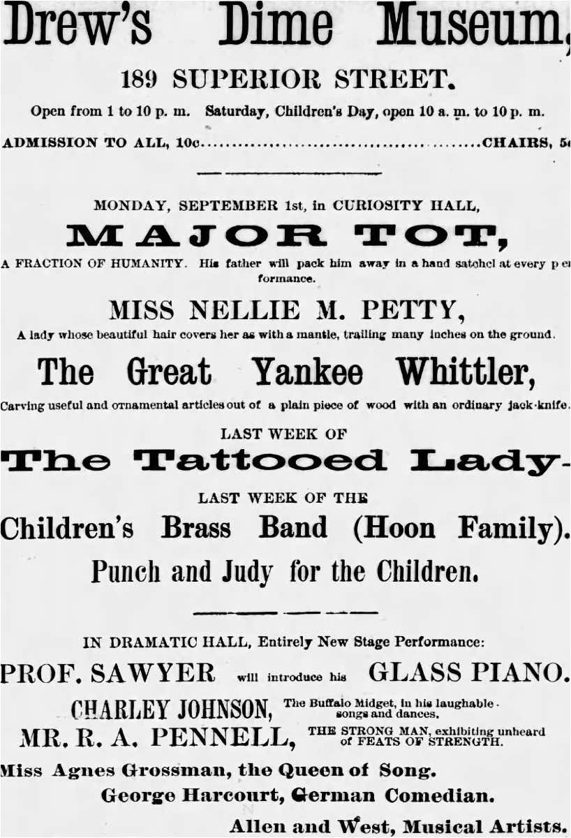 This dime museum ad touts Major Tot, a boy supposedly so small that "his father will pack him away in a hand satchel at every performance"; Miss Nellie M. Petty, who had exceptionally long hair; the Great Yankee Whittler, an accomplished wood carver; the Tattooed Lady; Children's Brass Band (Hoon Family); Punch and Judy; Prof. Sawyer and his glass piano; Charley Johnson, a dwarf; Mr. R. A. Pennell, a performer of "feats of strength"; singer Miss Agnes Grossman; German comedian George Harcourt; and musical artists and Allen and West. | Date: August 30, 1884 | Source: Cleveland Evening PostDownload Original File