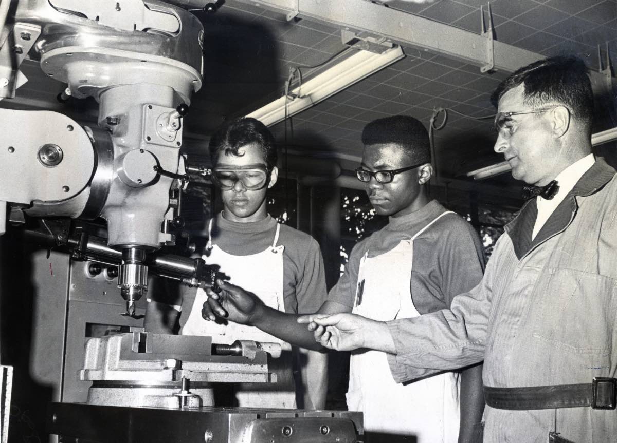 These students were among the dozen Cleveland high school seniors chosen for a summer program sponsored by National Acme Co. (one of the nation's largest machine tool manufacturers) at Max S. Hayes High School. The students earned $1.60 an hour to learn machine shop skills. Pictured (L-R) are students Carlos Flores and Alexander Foster and instructor Robert McCarthy. | Creator: Tim Culek | Date: June 25, 1968 | Source: Cleveland Press Collection, Michael Schwartz Library Special Collections at Cleveland State UniversityDownload Original File