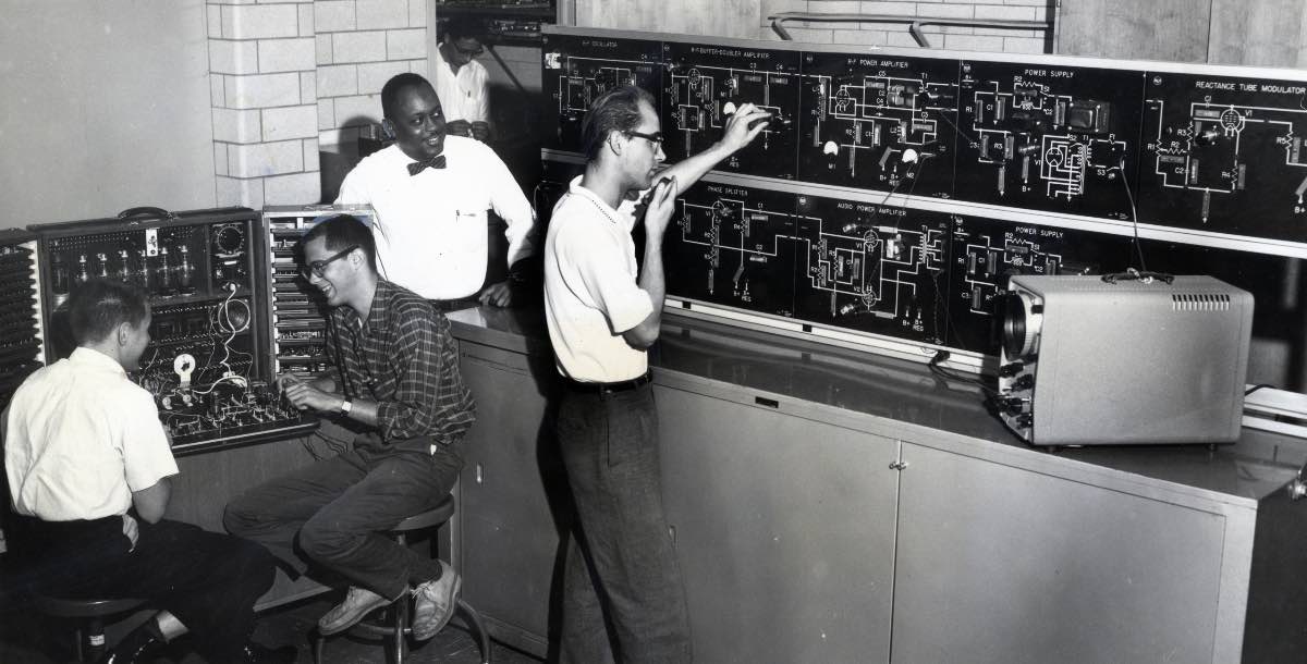In 1962, Max Hayes added a new laboratory to support its two-year post-graduate electronics technician training course. In this photo, students Luther Jenkins and James Hearst at left were building an industrial control circuit. Instructor Curtis Mapp looks on as another student, Floyd Smith (right) connects a transmitter to an RCA demonstrator. The school bought this equipment using funds from the National Defense Education Act, a 1958 bill that Congress had passed to support American scientific and technological education in response to the Soviet launch of the Sputnik satellite. | Creator: Bill Nehez | Date: October 18, 1962 | Source: Cleveland Press Collection, Michael Schwartz Library Special Collections at Cleveland State UniversityDownload Original File