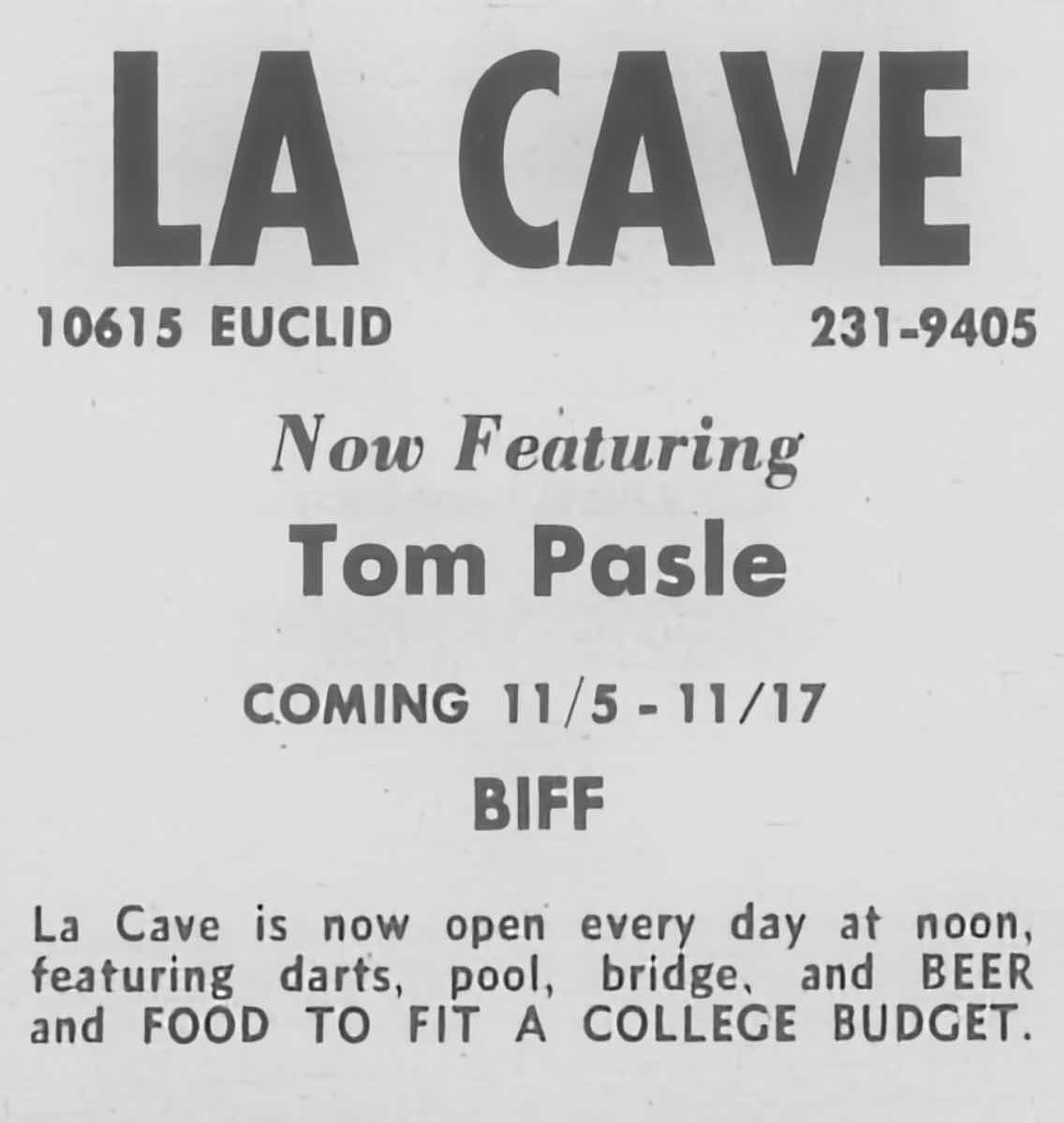 La Cave advertisement featuring performances of Tom Pasle, new hours, and other amenities. | Date: November 1, 1963 | Source: The CaseTech (Case Western Reserve University Archives)Download Original File