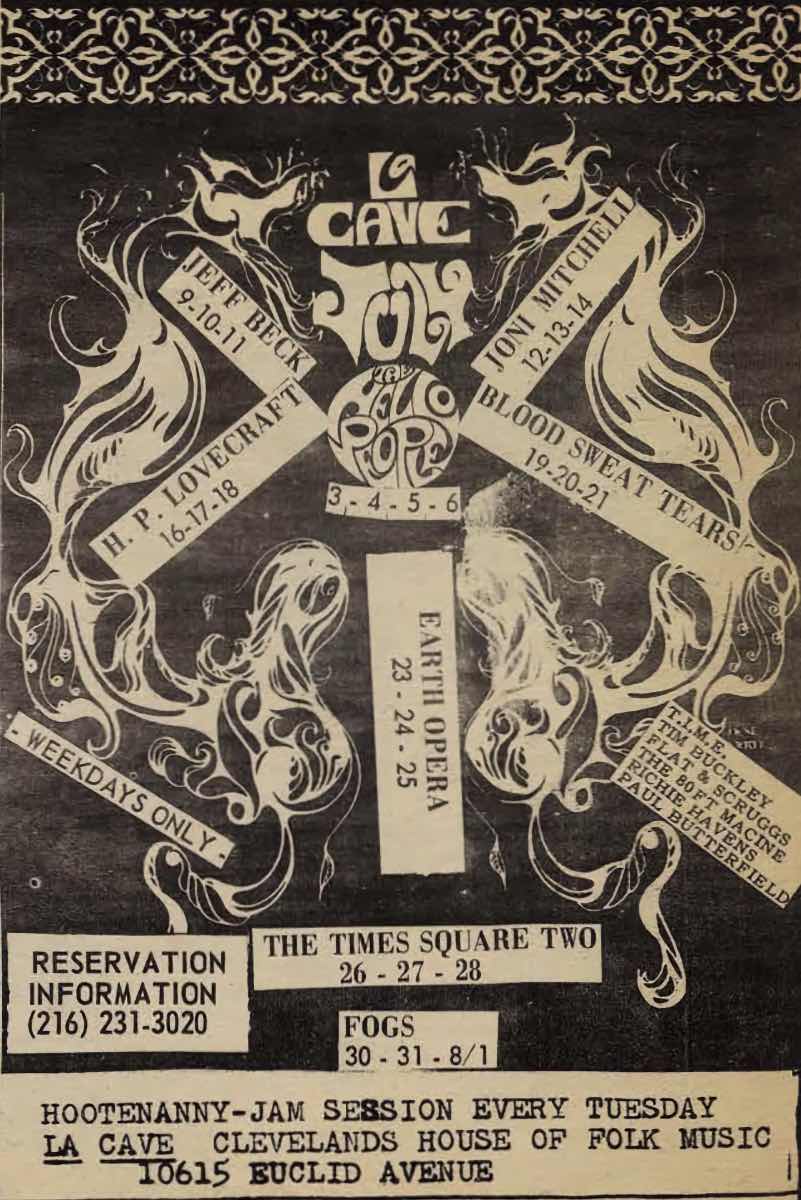 July 1968 Shows at La Cave ID: 12509 | This file appears in: La Cave A sampling of La Cave's July 1968 performance offerings including Jeff Beck; Joni Mitchell; Blood, Sweat, and Tears, and others. | Date: July 1968 | Source: The Buddhist Third Class Junkmail Oracle Download Original File SourceThe Buddhist Third Class Junkmail OracleDateJuly 1968 "July 1968 Shows at La Cave" appears in: La Cave