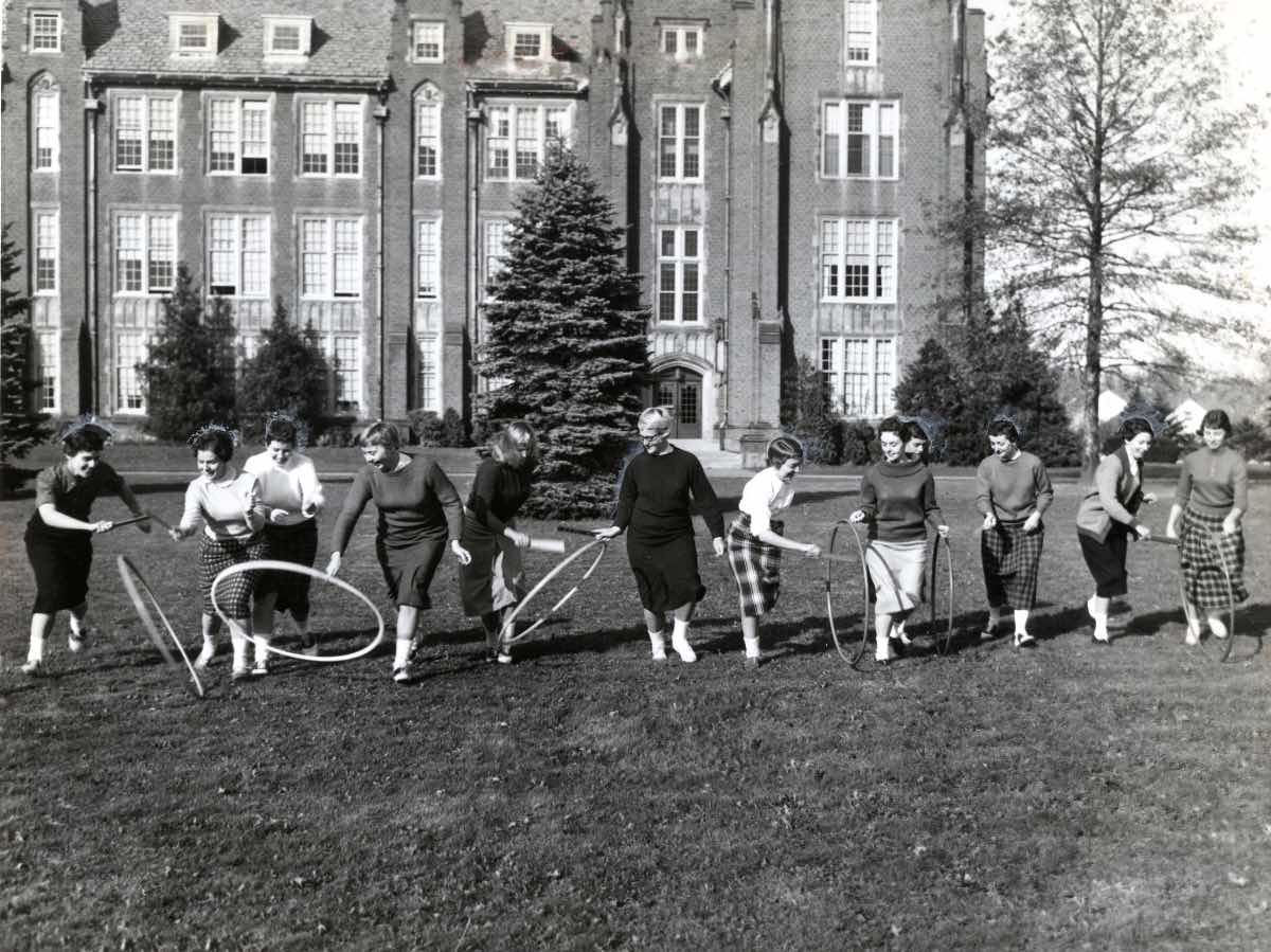 Students participate in a hula-hoop relay race on the quad in the middle of campus. | Date: November 10, 1958 | Source: Cleveland Press Collection, Michael Schwartz Library Special Collections at Cleveland State UniversityDownload Original File