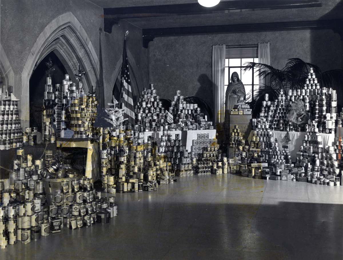The 246 students of Notre Dame College staged a canned food drive that collected 6,424 cans to donate to the Notre Dame convent in the Netherlands for distribution to the needy. The average donation was 26 cans per student, and the Class of 1949 (sophomores) won the contest to see which class collected the most. They collected an average of 48 cans per student. Pictured (left to right) are sophomores Mary Smith, Dorothy Wager, and Bobby Burns. | Creator: James Thomas | Date: December 11, 1946 | Source: Cleveland Press Collection, Michael Schwartz Library Special Collections at Cleveland State UniversityDownload Original File