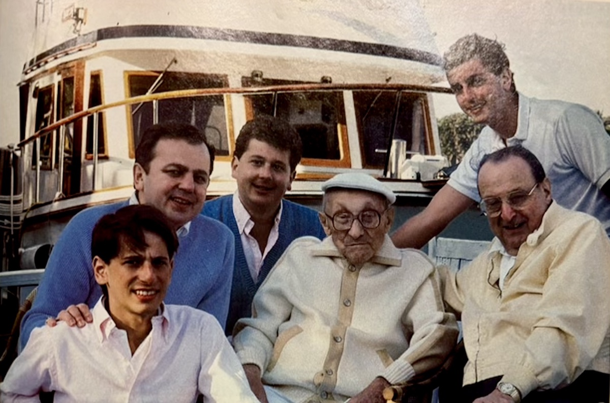 In the center of this photo is centenarian Jacob Sapirstein, the founder and first president of American Greetings Corp. To Jacob's left is his son, Irving Stone, who served as president of American Greetings from 1960-1978. In the blue sweater (with right hand on son Jeffrey's shoulder) is Morry Weiss, Irving's son-in-law, who would become the third president, serving from 1978 to 1990. From 2003 to 2018, Jacob's great-grandsons, Jeffrey and Zev Weiss (to extreme right of photo) served respectively as president and CEO of the company. | Creator: Fortune Magazine | Date: circa 1985 | Source: Cleveland State University, Michael. Schwartz LibraryDownload Original File