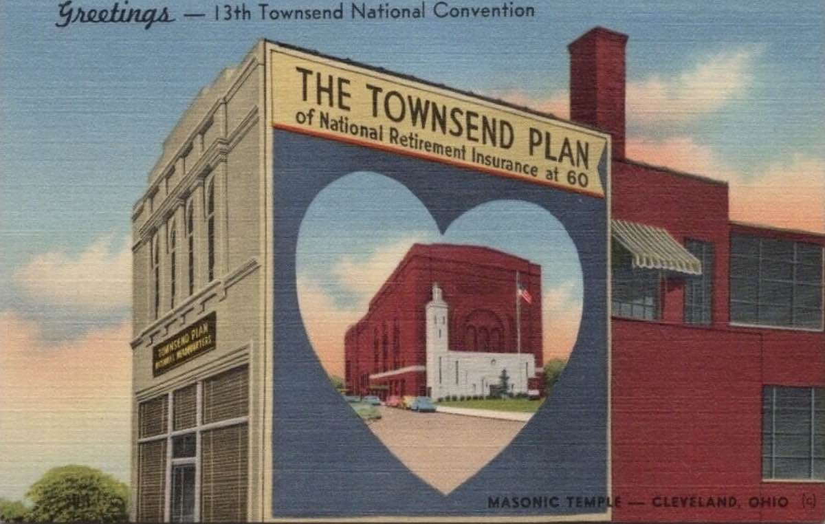 This postcard shows the Broadway Avenue headquarters of the Townsend Insurance Company. The building is adorned with an advertisement for its 13th annual convention, held at the Masonic Temple. The Townsend Plan for retirement insurance was influential in the passage of the Social Security Act of 1935. | Creator: Braun Art Publishing Co. | Date: 1953 | Source: Cleveland Memory, Michael Schwartz Library Special Collections at Cleveland State UniversityDownload Original File