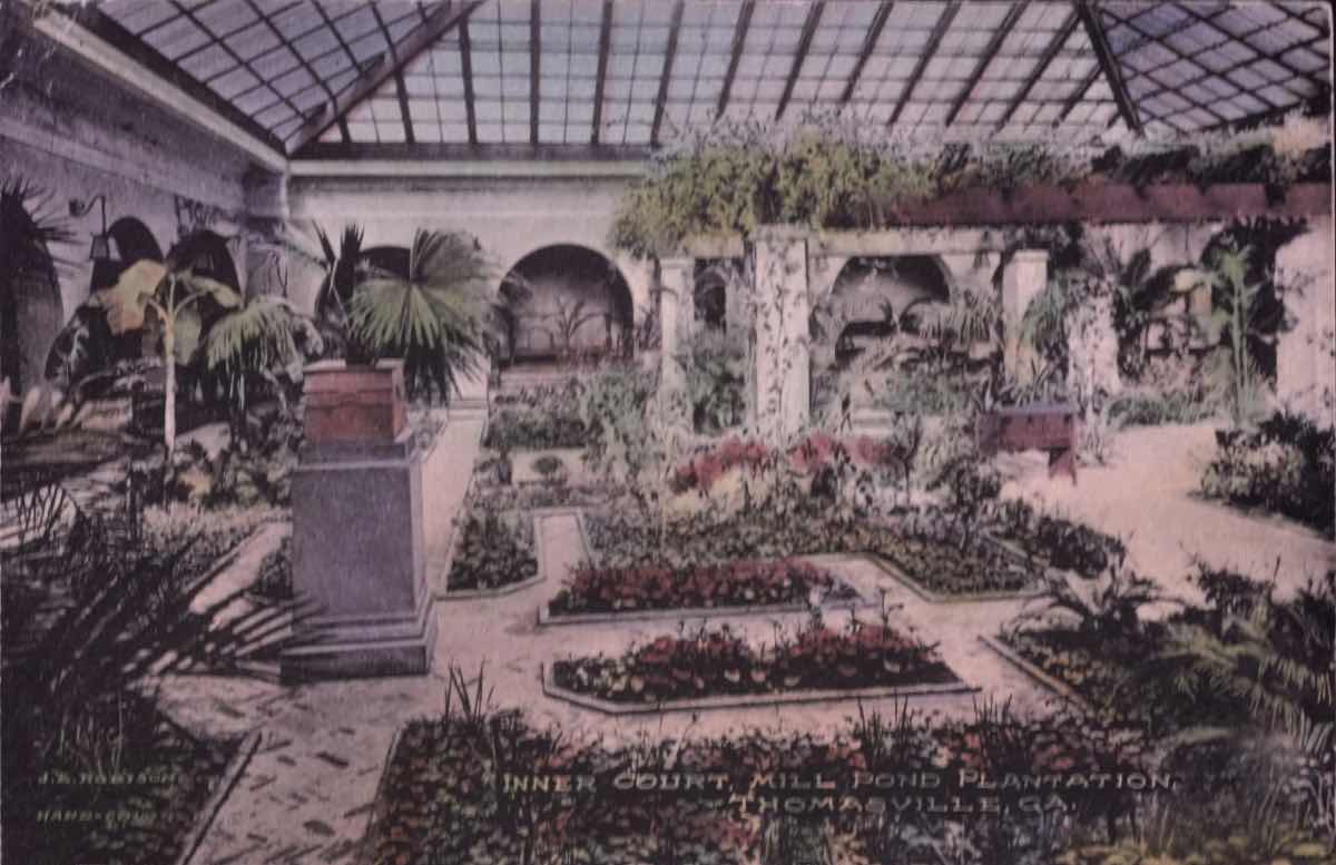 Millpond was unusual not only because it bucked the pattern of employing the Classical Revival style for both older antebellum plantation homes and newer hunting retreat homes in Thomasville, but also because of its central feature—a pyramidal atrium with retractable glass panels that enabled a combination of indoor and open-air gardening inside. The low-slung tile-roofed mansion's rooms surrounded this atrium. Despite Millpond's low profile, it contains 38,000 square feet of space, including the atrium. | Creator: J. E. Robinson & Co. | Date: ca. 1920s | Source: Smithsonian Institution, Archives of American GardensDownload Original File
