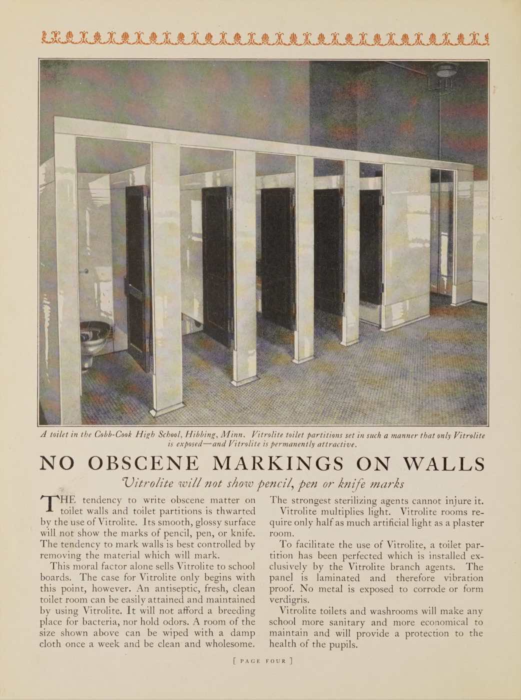 Vitrolite everlasting slab material applied to schools, colleges, and universities. | Creator: The Vitrolite Company | Date: 1923 | Source: The Vitrolite Company: Archive.orgDownload Original File