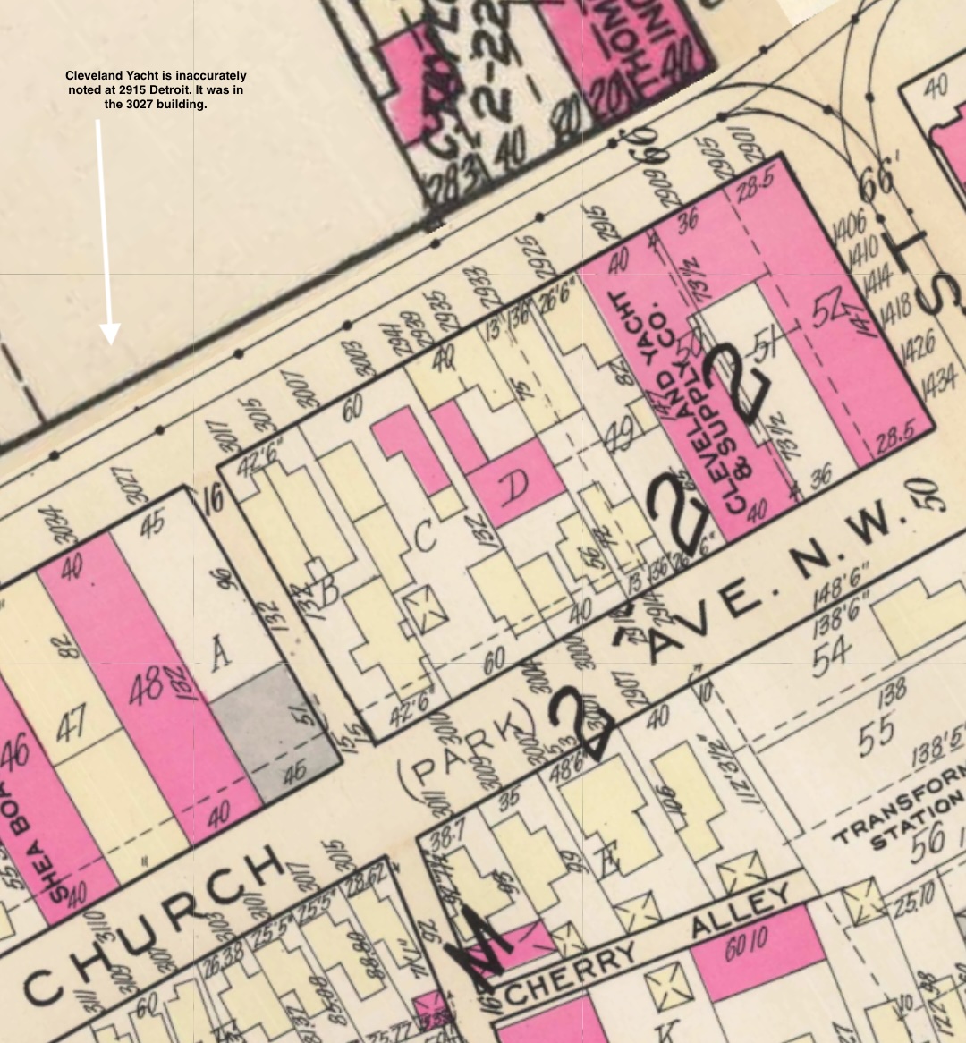 The Vitrolite showroom was built in 1926 and occupied the entire building on Detroit Ave. (the unlabeled street atop the map). Cleveland Historical Maps (1927-37) mislabeled the building at 2915 Detroit as The Cleveland Yacht and Supply Company. | Creator: Cleveland Historical Maps. | Date: 1927 - 1937 | Source: https://www.arcgis.com/apps/View/index.html?appid=ddb0ee6134d64de4adaaa3660308abfd
