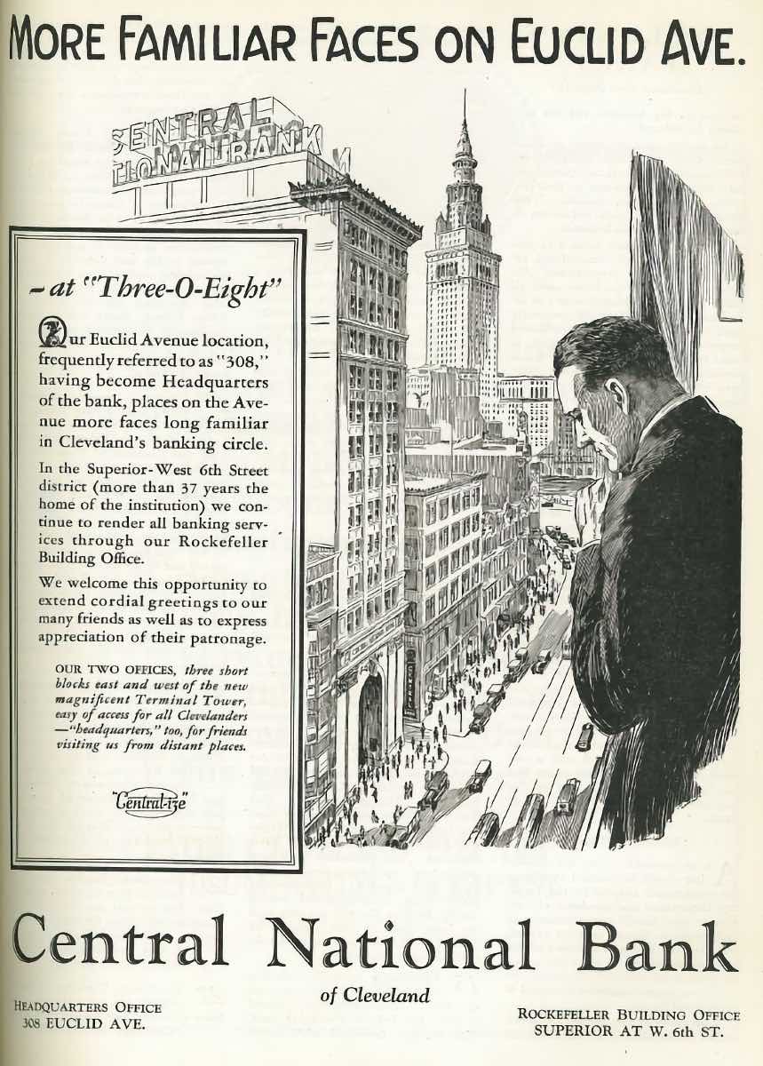 "Our Euclid Avenue location, frequently referred to as '308,' having become Headquarters of the bank, places on the Avenue more faces long familiar in Cleveland's banking circle. In the Superior-West 6th Street district (more than 37 years the home of the institution) we continue to render all banking services through our Rockefeller Building Office. We welcome this opportunity to extend cordial greetings to our many friends as well as to express appreciation of their patronage." | Date: December 1927 | Source: The ClevelanderDownload Original File