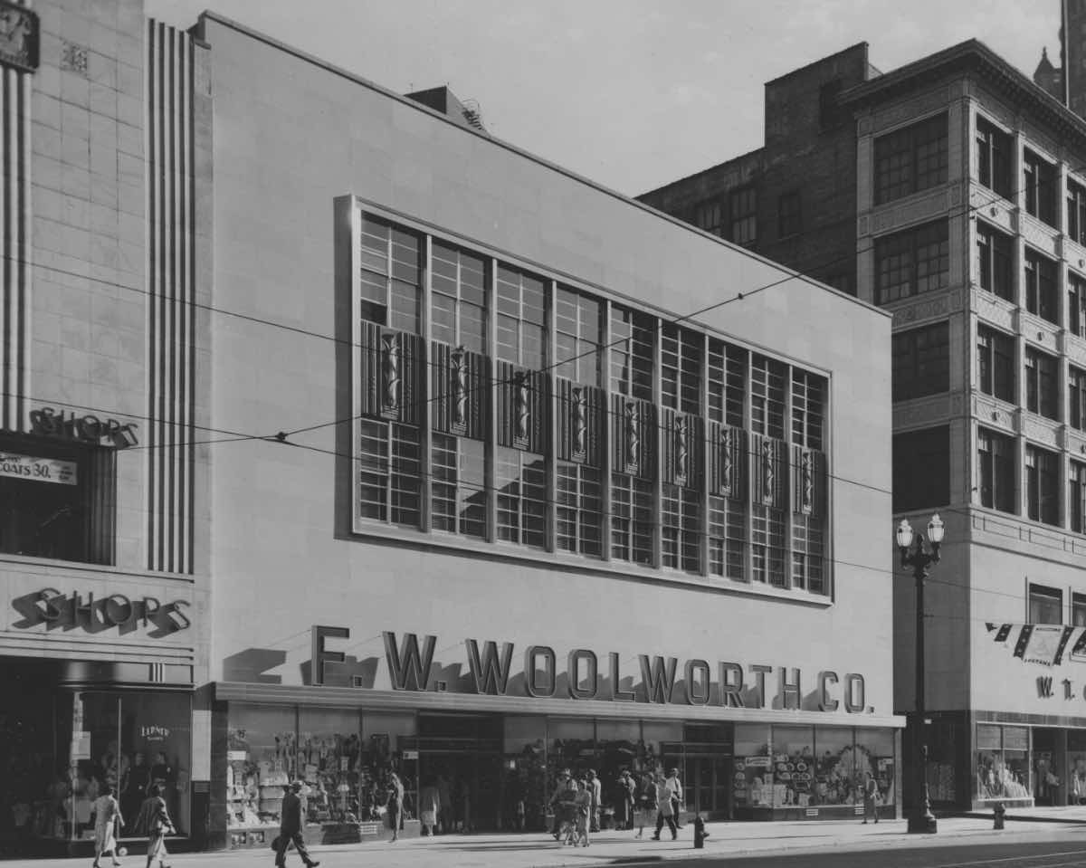 Central National Bank sold its headquarters building at 308 Euclid to the F. W. Woolworth Co. in 1943 but continued to lease space until it moved to the Midland Building in 1949. Woolworth demolished the 17-story building and moved its downtown store from the southwest corner of Euclid and East 4th to this location in 1951. Today it is the front entrance of the House of Blues. | Date: ca. 1950s | Source: Cleveland Public Library, Photograph CollectionDownload Original File