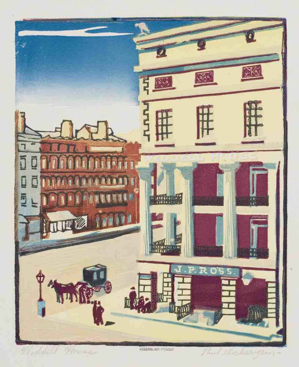 This New Deal artwork imagines the Weddell House as it looked in Abraham Lincoln's day. The "J. P. Ross" sign above the entrance refers to the hotel operator who managed the Weddell House in the early 1860s. Born in Utica, New York, Paul Kucharyson (1914-1977) was an American printmaker whose art depicted everyday American scenes ranging from farms to streetscapes. He is especially known for his work in the Works Progress Administration (WPA) Federal Art Project. | Creator: Paul Kucharyson | Date: ca. 1935-1939 | Source: Cleveland Public Library, Fine Arts and Special Collections DepartmentDownload Original File