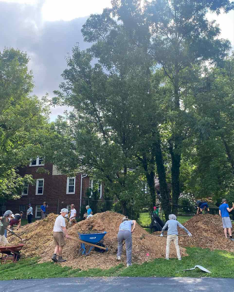 Volunteers from Heights Tree People, a local nonprofit organization, planted 188 trees in a new "urban mini-forest" on the eastern edge of the Coventry PEACE Campus. Heights Libraries received a grant for the project from the Cuyahoga County Urban Tree Canopy program and worked with Heights Tree People to plant and cultivate the forest. Mulching (shown here) got underway in 2023, with planting commencing the following year. | Creator: Heights Tree People | Date: 2023Download Original File