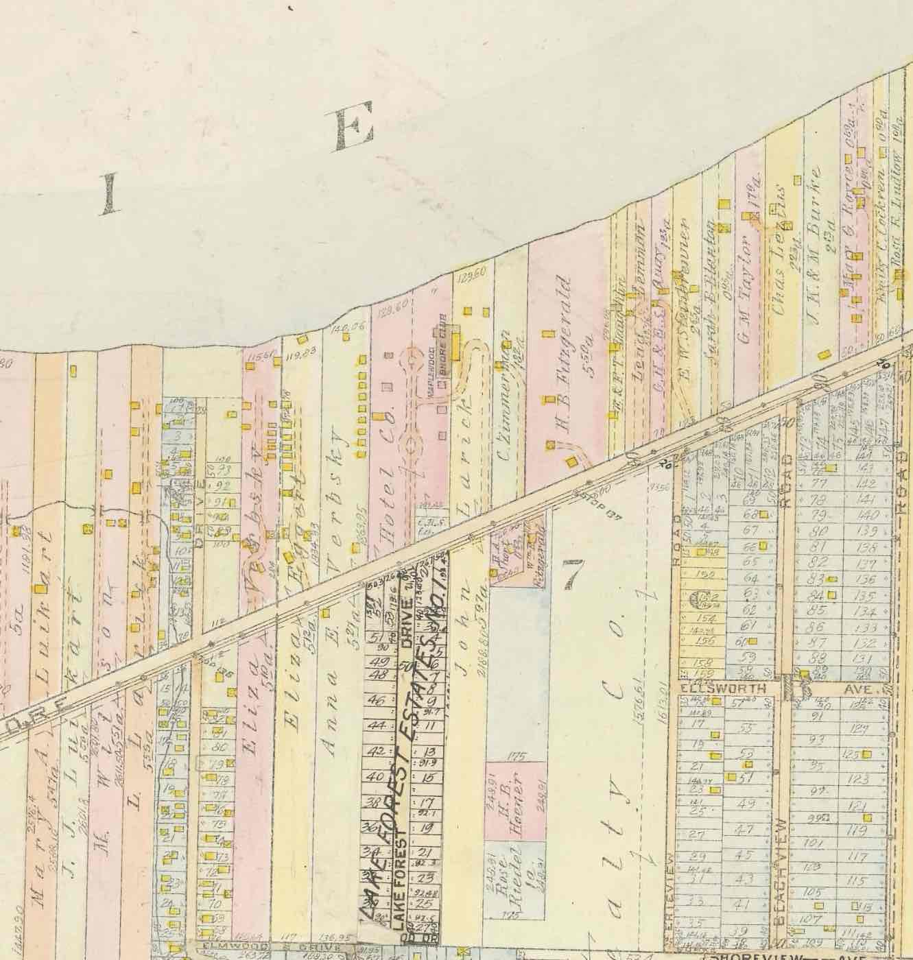 The Maplewood Shore Club appears on the lakefront just above the center of this map. The portion of Stein's land south of Lake Shore Boulevard had been subdivided into Lake Forest Estates No. 1 subdivision, which was owned by John H. Boldon of Akron. | Date: 1920 | Source: Plate 11. Plat Book of Cuyahoga County, Ohio, Volume 3. Philadelphia: G. M. Hopkins, 1920. Cleveland Public Library, Map CollectionDownload Original File