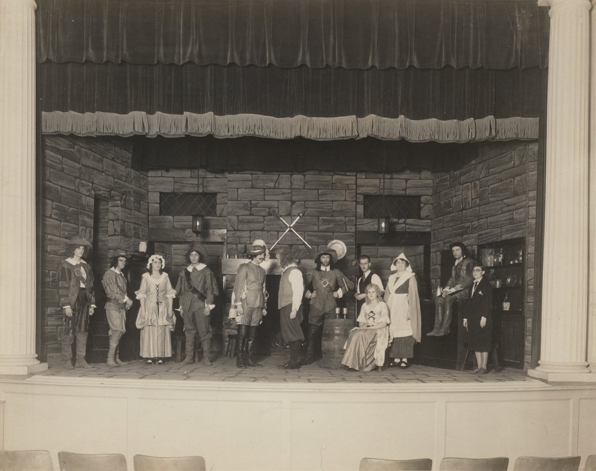 This black and white photograph of the production "Cock Robin" by Philip Barry and Elmer Rice shows twelve men and women wearing musketeer-style costumes. | Creator: Sutcliffe Studio | Date: 1929 | Source: Shaker Historical SocietyDownload Original File