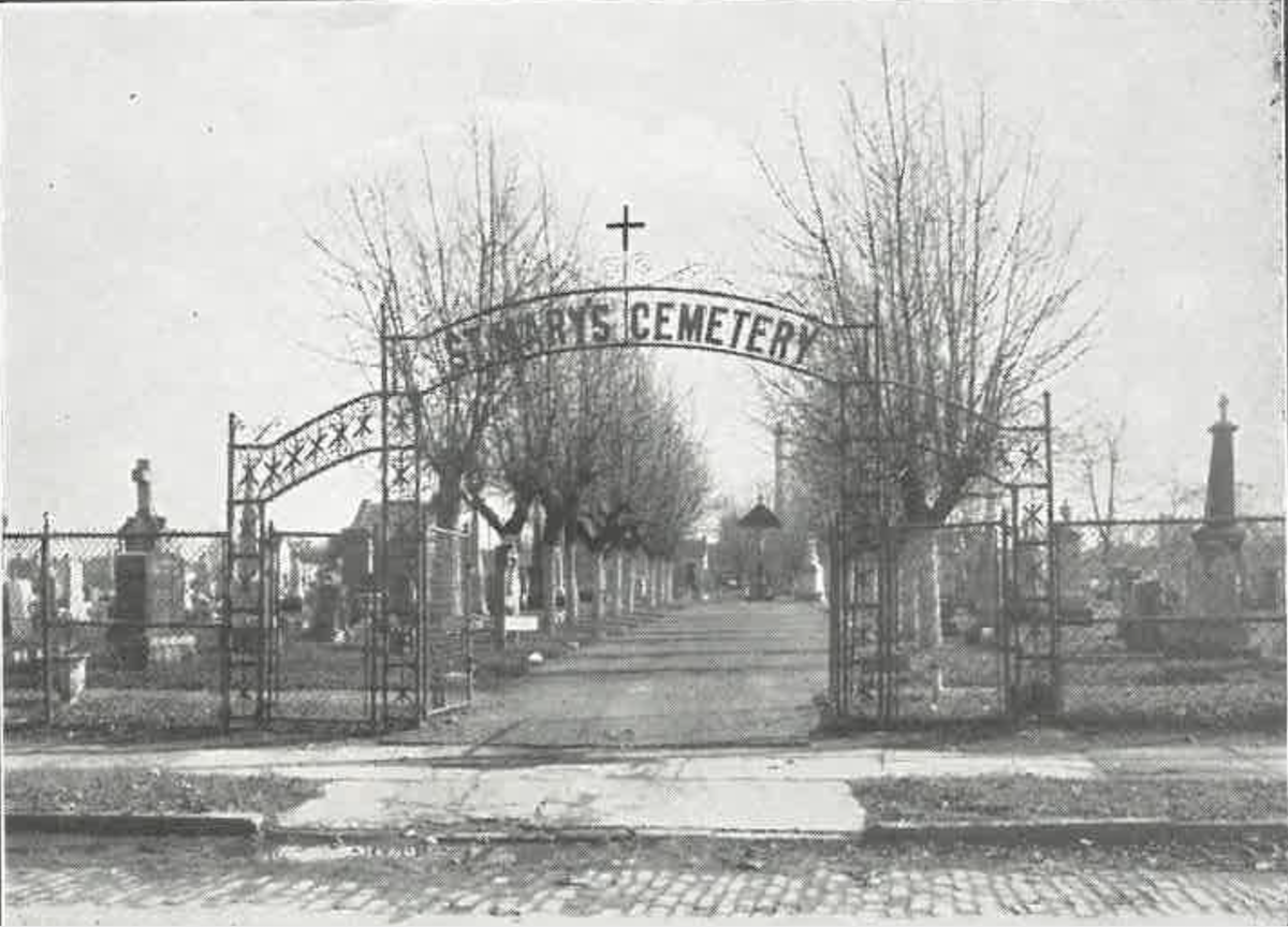 The once ornate West 41st Street entranceway to St. Mary Cemetery. ID: 12855 | This file appears in: St. Mary Cemetery Date: 1929 | Source: Cleveland Catholic Diocese Archives Download Original File SourceCleveland Catholic Diocese ArchivesDate1929 "The once ornate West 41st Street entranceway to St. Mary Cemetery." appears in: St. Mary Cemetery