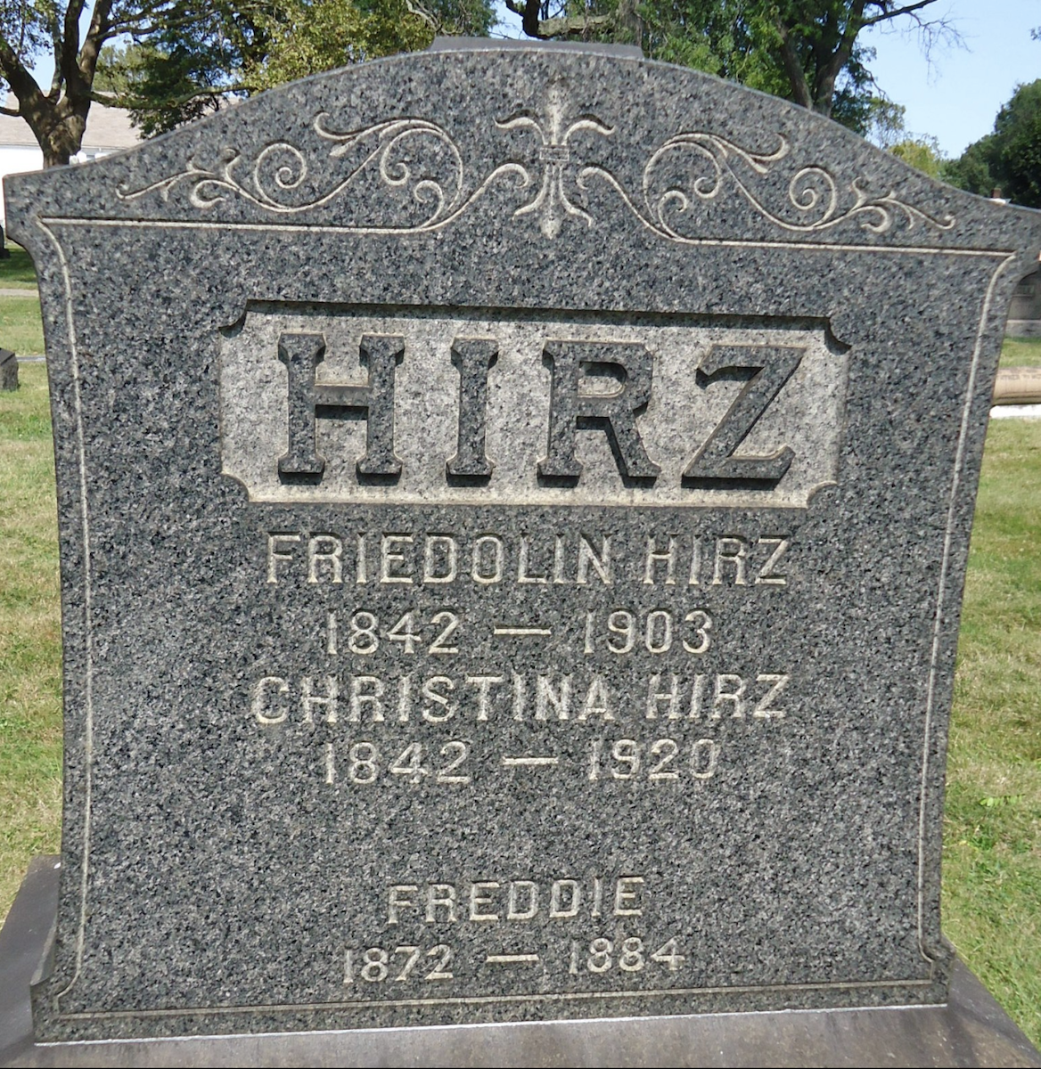This photo is of a granite marker over the graves of German immigrants Heidilin and Christina Hirz at St. Mary Cemetery. The style, material used, and the condition of this marker strongly suggest that it is a replacement for an original sandstone marker that may have been destroyed by weather or vandalism. | Source: Findagrave.comDownload Original File