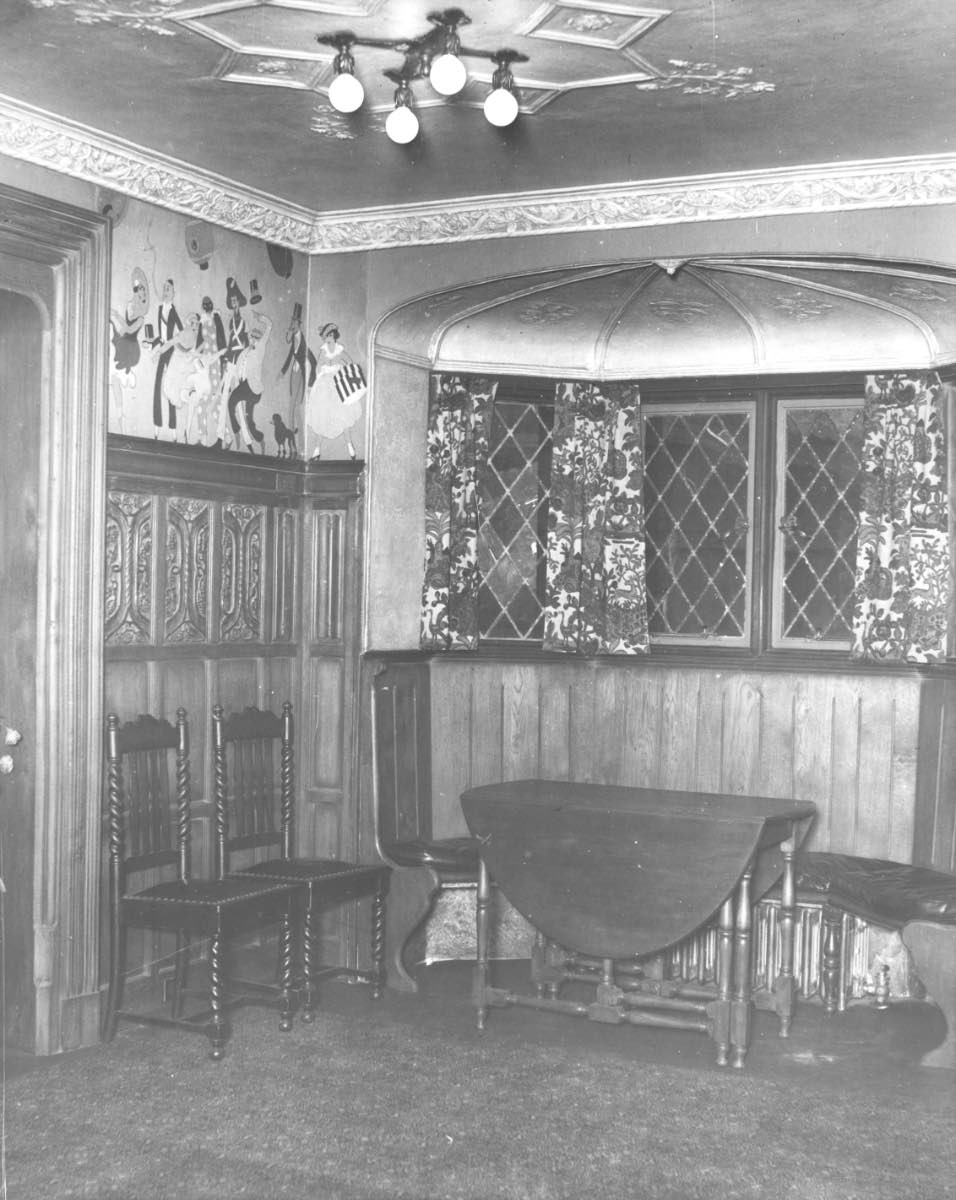 This black and white photograph captures an interior room in the Hermit Club building on 1629 Dodge Court. There are no people but the image shows the Tudor-influenced style of the club's interior, including wood-paneled walls and leaded windows. | Creator: Unknown | Date: January 9, 1979 | Source: Cleveland Press Collection, Michael Schwartz Library Special Collections at Cleveland State University Download Original File