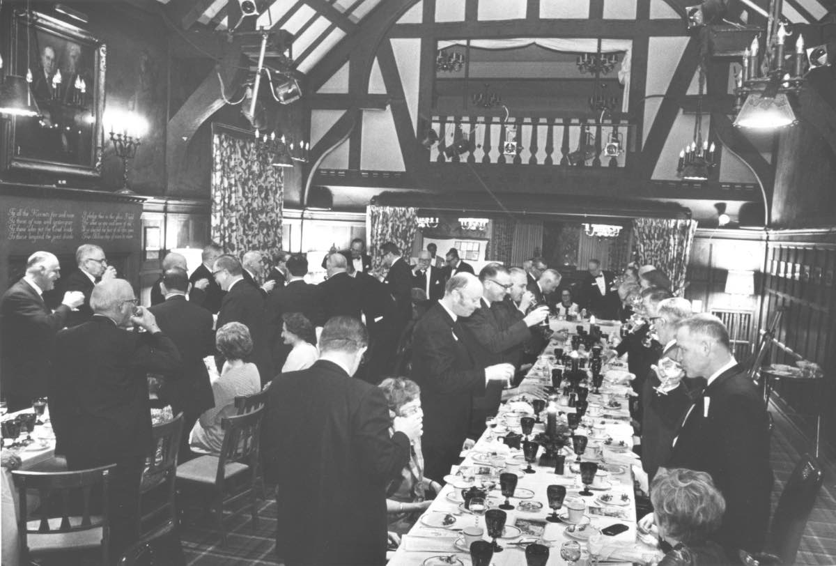 This black and white image shows a banquet hosted by the Hermit Club. There are long tables filling the room and those photographed are in suites and dresses. | Date: January 15, 1970 | Source: Cleveland Press Collection, Michael Schwartz Library Special Collections at Cleveland State University Download Original File