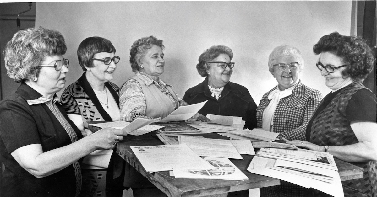 Women formerly parishioners at Saints Peter and Paul Ukrainian Catholic Church cheerfully discuss their new parish, Saint Josaphat Ukrainian Catholic Church. | Date: December 18, 1959 | Source: Cleveland Public Library, Photograph CollectionDownload Original File