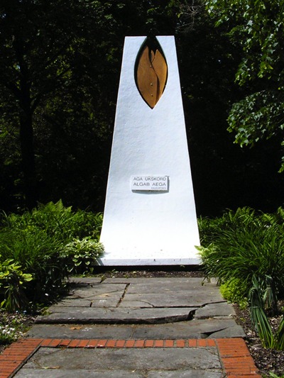 Designed and created by artist Clarence E. Van Duzer, the centerpiece of the Estonian Garden is the flame sculpture. It was dedicated at the opening of the Estonian Garden in 1966 and stands as one of the few non-representational sculptural elements in the Cultural Gardens. The flame is carved from golden oak, making it the first monument in the gardens to incorporate wood.