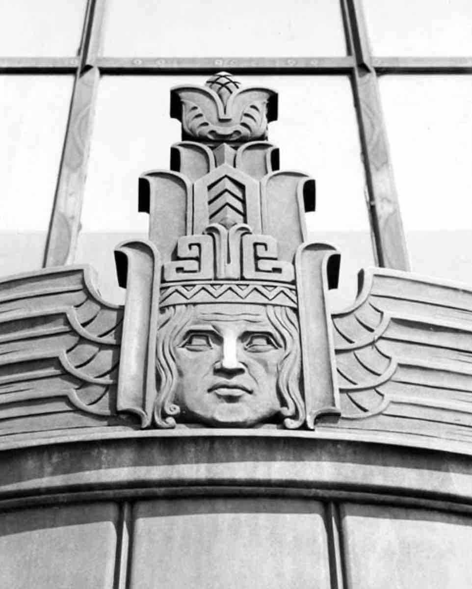 Blending Art Deco abstraction with Mayan and Egyptian Revival influences, this original stonework above Fenn Tower’s entrance blends suggests power and permanence. Its motifs—repeated throughout the building—reflect the late 1920s fascination with ancient civilizations recast for a modern age. | Source: Cleveland Memory, Michael Schwartz Library Special Collections at Cleveland State UniversityDownload Original File