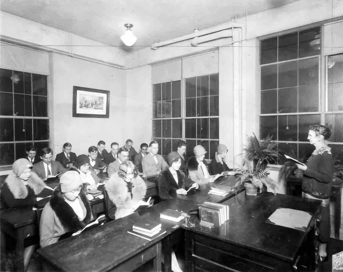 Fenn College grew out of the Cleveland YMCA's educational programs. Classes like Alta Weaver's English class at the YMCA's preparatory school were held at the Central YMCA on Prospect Avenue and in three adjacent houses before the school moved to the former National Town and Country Club's abandoned tower in 1938. | Date: ca. 1923 | Source: Cleveland Memory, Michael Schwartz Library Special Collections at Cleveland State UniversityDownload Original File