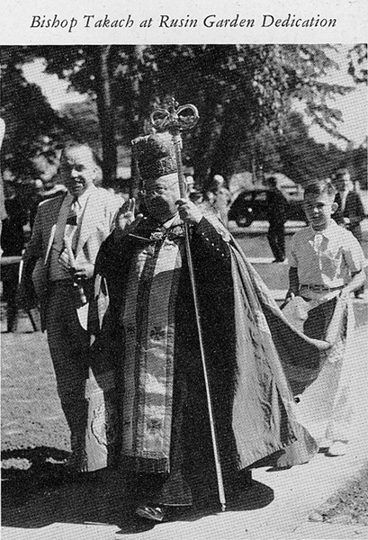 Right Reverend Bazil Takach of Pittsburgh, Bishop of the Greek Catholic Diocese of America, arrives at the dedication ceremonies for the Rusin Cultural Garden. In his speech that day, Takach remarked, "With all your attention to the culture of your ancestors, do not forget to be loyal to this, our adopted country."