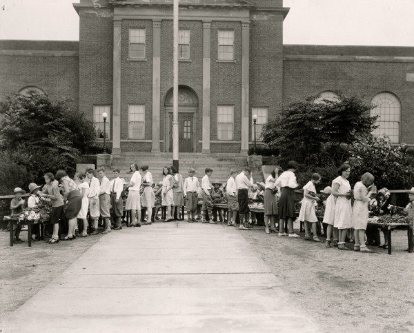 Children from Benjamin Franklin Elementary School sell the produce grown in their school gardens to older students. | Date: 1940 | Source: Cleveland Memory Project, Cleveland State University Library Special CollectionsDownload Original File