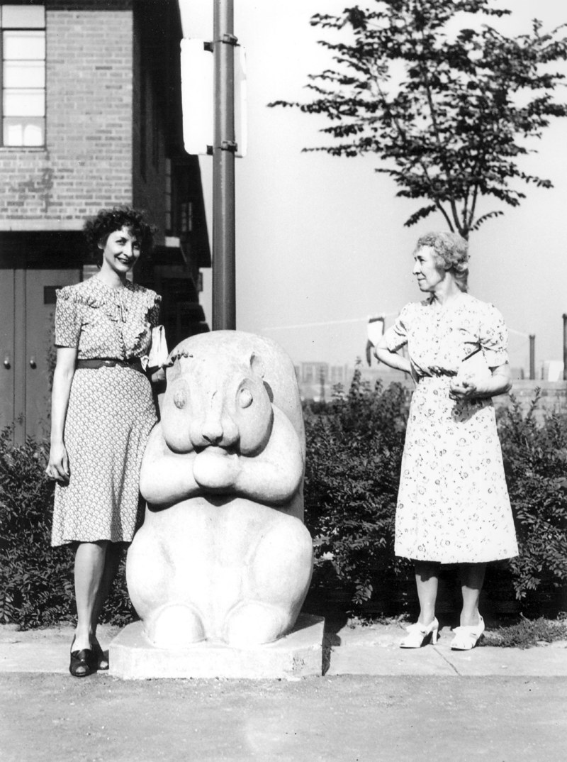 Edris Eckhardt (left), a Cleveland artist and supervisor of the ceramic and sculpture unit of the Ohio WPA Art Project, poses with one of the eight concrete animal sculptures placed around the Valleyview Homes at the time of its opening.
