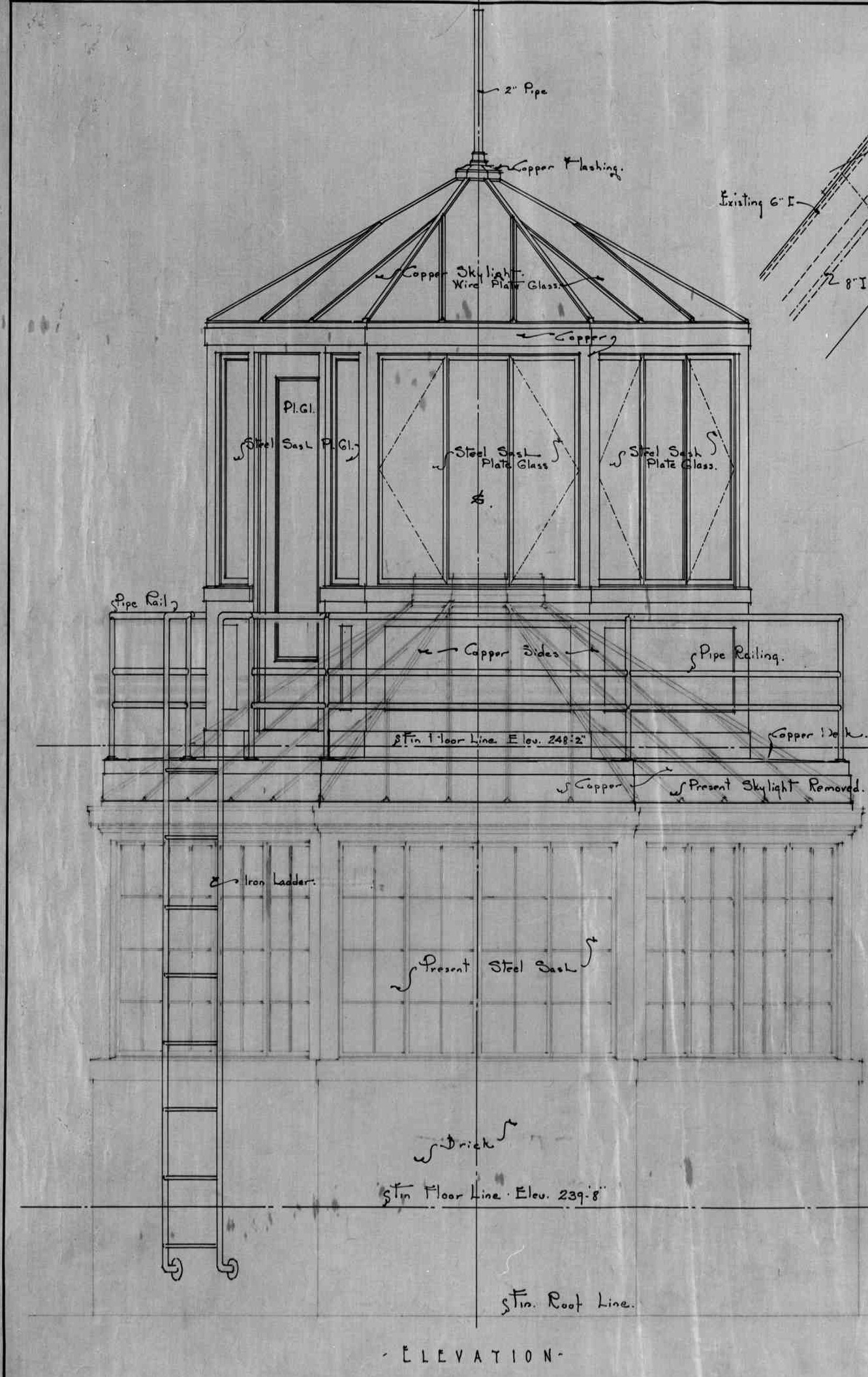 This drawing shows the plans for the Cleveland Airport's air traffic control tower. The tower was attached to the main terminal that opened in 1929, and was the first air traffic control tower in the nation. Two-way radio communication was added to the tower around 1930. This was also a first in the aviation industry.