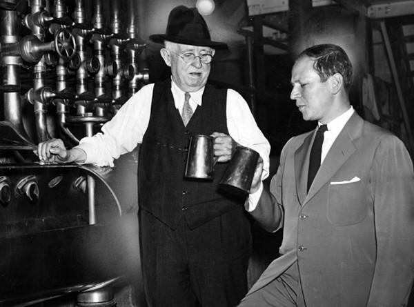 Brewmaster Carl Faller (left) and owner Herbert Leisy sample their new beer, the Leisy Dortmunder. | Date: June 5, 1939 | Source: Cleveland Memory Project, Cleveland State University Library Special CollectionsDownload Original File