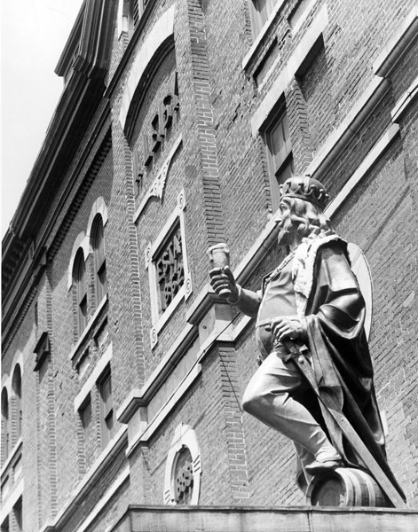 A statue of King Gambrinus, the unofficial patron saint of beer and beer brewing, stands outside the Leisy plant in 1951. Gambrinus is a mythological figure whose exact origins are not known. One legend states that he was John the Fearless, King of Flanders during the Middle Ages and the inventor of hop-brewed beer, while another story traces his legend to the court of Emperor Charlemagne some 500 years earlier. His figure is portrayed on statues, labels, and beer steins across the world. | Source: Cleveland Memory Project, Cleveland State University Library Special CollectionsDownload Original File