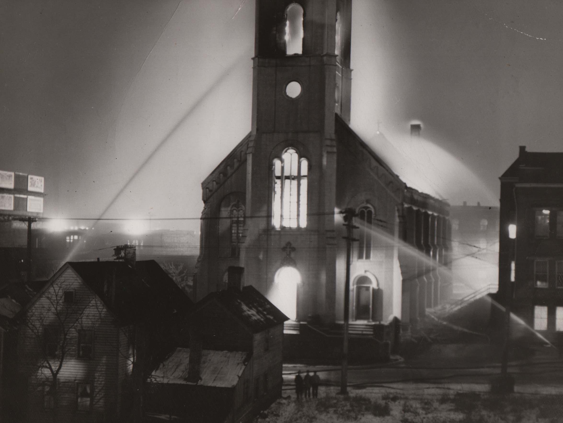 Despite the best efforts of firefighters, a fire destroyed St. Malachi Church on December 23, 1943. | Source: Special Collections Department, Cleveland State UniversityDownload Original File