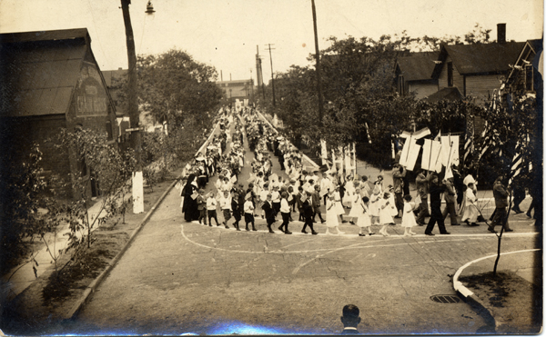 Founded in 1901, St. Lawrence Roman Catholic Church on East 82nd Street met the religious, social, and educational needs of the Slovenian community in the area. In this 1928 photograph, Father John Oman, head priest for 48 years at St. Lawrence, leads the congregation in the annual Corpus Christi procession. The celebration had both religious and cultural significance for the Slovenian Catholic community. | Date: 1928 | Source: Cleveland State Library Special CollectionsDownload Original File