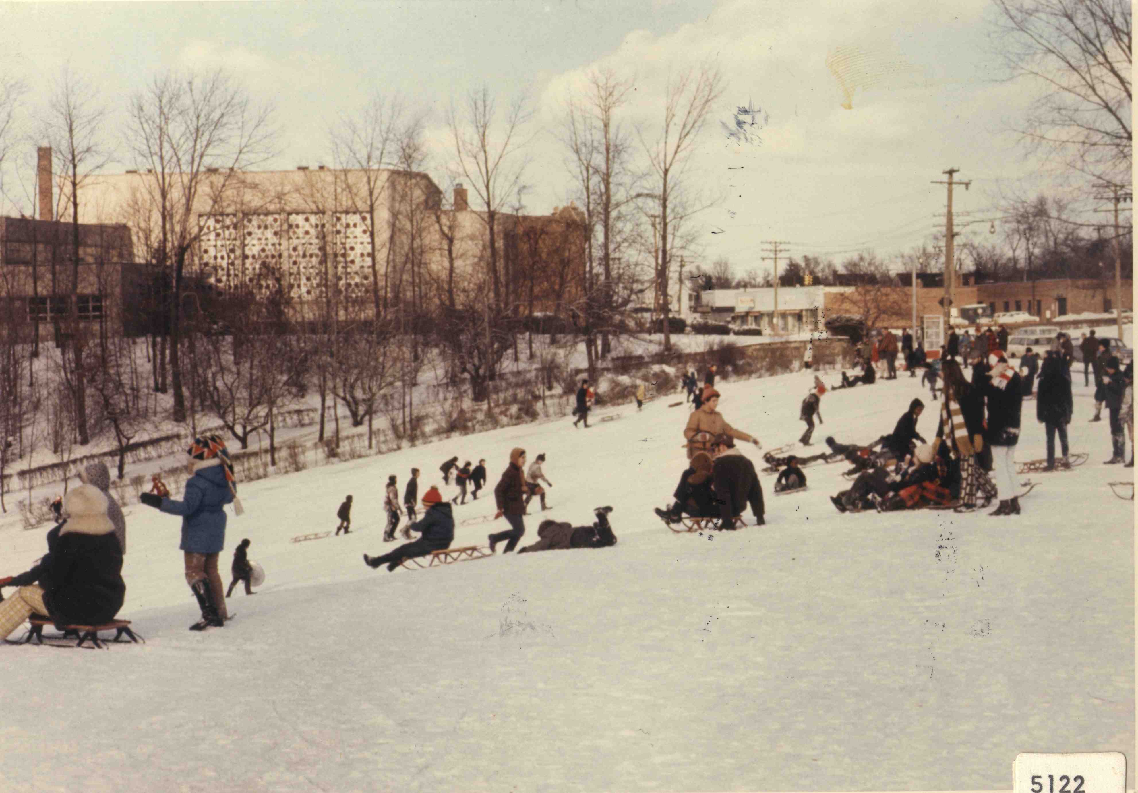 Located off of Taylor Road near Superior Road, the Cain Park sledding hill has delighted generations of Cleveland Heights youngsters ever since Works Progress Administration (WPA) workers cleared the space of debris and trees at the beginning of the 1930s. The foot of the sledding hill was also where Dina Rees Evans staged A Midsummer Night's Dream in 1934, which was the first dramatic performance ever at Cain Park. In this photograph from 1970, the Taylor Road Synagogue and businesses along Taylor Road can be seen in the background. | Source: Cleveland Heights Historical SocietyDownload Original File