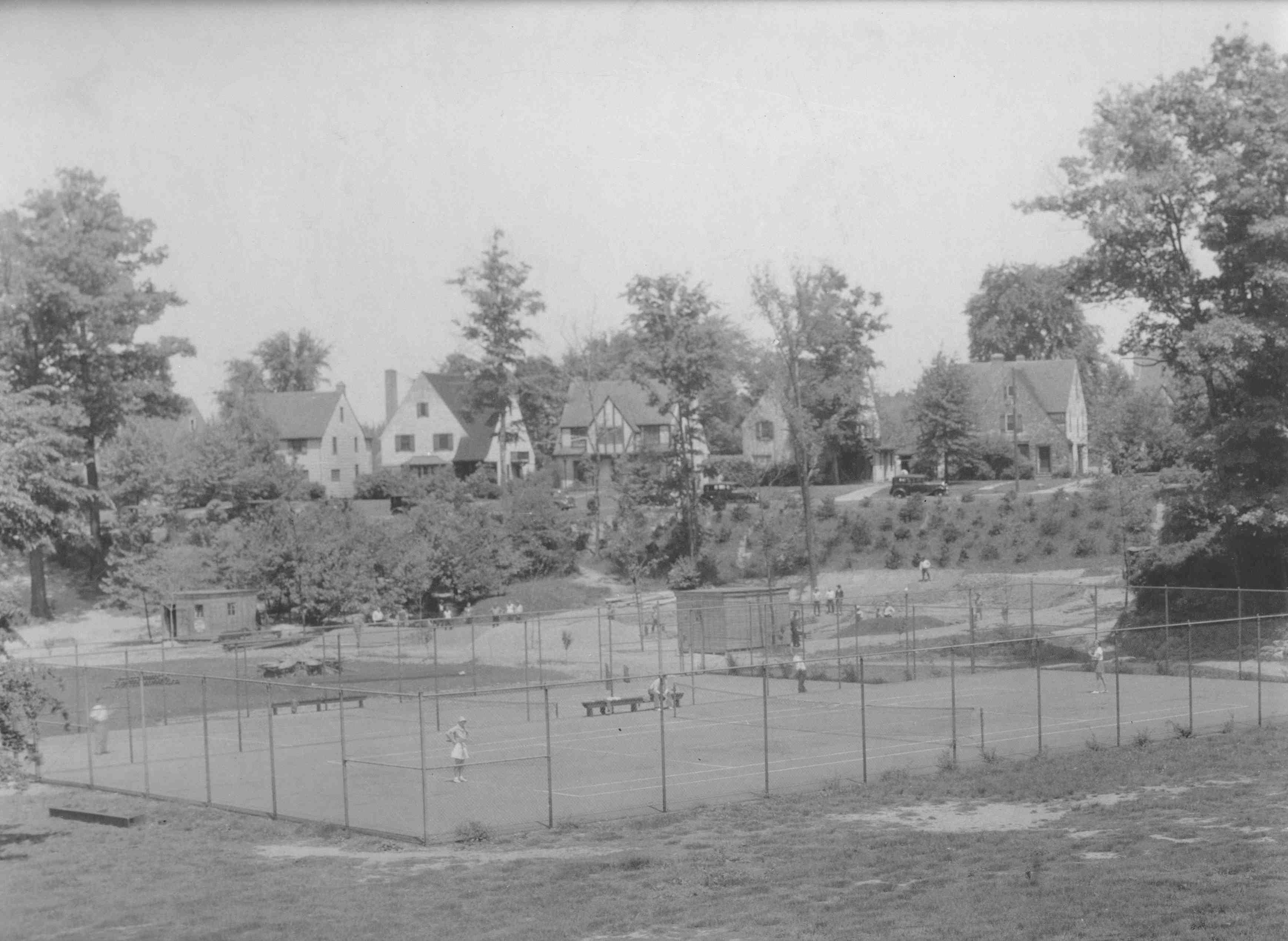 The tennis courts at Cain Park were installed in the mid-1930s as the park was transformed from a "wild" ravine into a place for public recreation. The wooden booths near the courts were used for changing. In the background, men appear to be working on landscaping. | Source: Cleveland Heights Historical SocietyDownload Original File