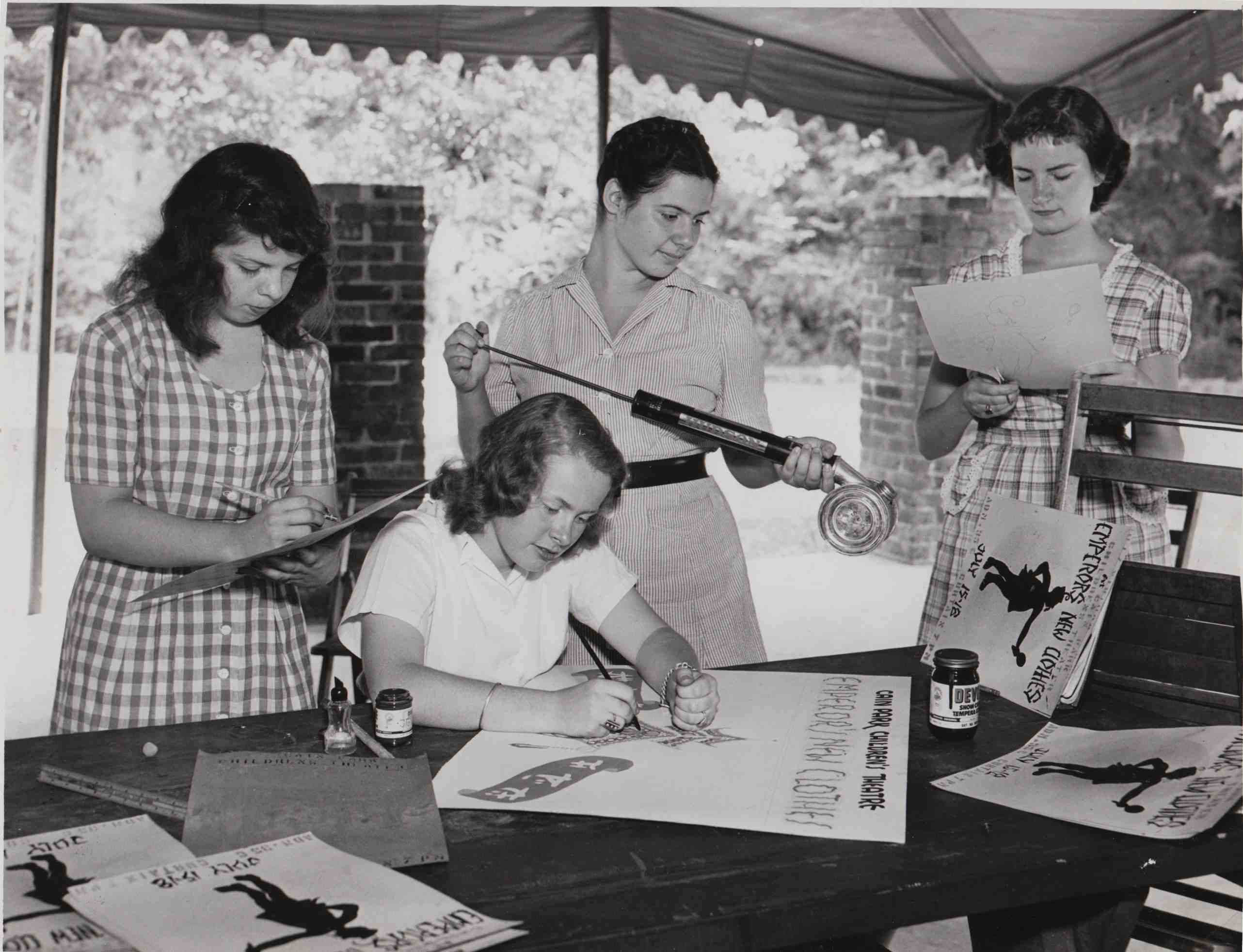 Members of the Cain Park Children's Theater make posters for their staging of "The Emperor's New Clothes" during the summer of 1946. One of the goals of Cain Park Theater, as well as that of its first theatrical director Dina Rees Evans, was to involve youngsters in the staging of shows. Evans, who taught drama at Cleveland Heights High School, felt strongly about the ability of drama education to have a positive effect on students. | Source: Cleveland Memory Project, Cleveland State University Library Special Collections