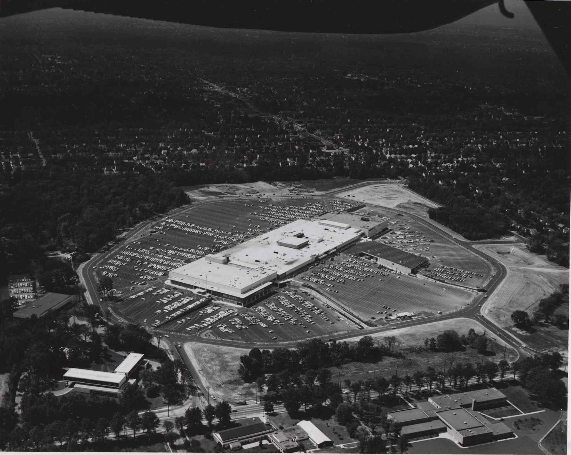 Higbee's is the anchor to the left of the center building, while Halle's is to the right. The fourth building jutting out from the main mall is a Fisher Foods supermarket. Mayfield Road runs east to west in the foreground. Fifty acres of parking spaces encircled the mall. The trees to the rear (located on the mall's southern side) were added to placate angry residents on nearby streets who were afraid of the mall's effects on the beauty of their neighborhood. | Source: Cleveland Memory Project, Cleveland State University Library Special CollectionsDownload Original File