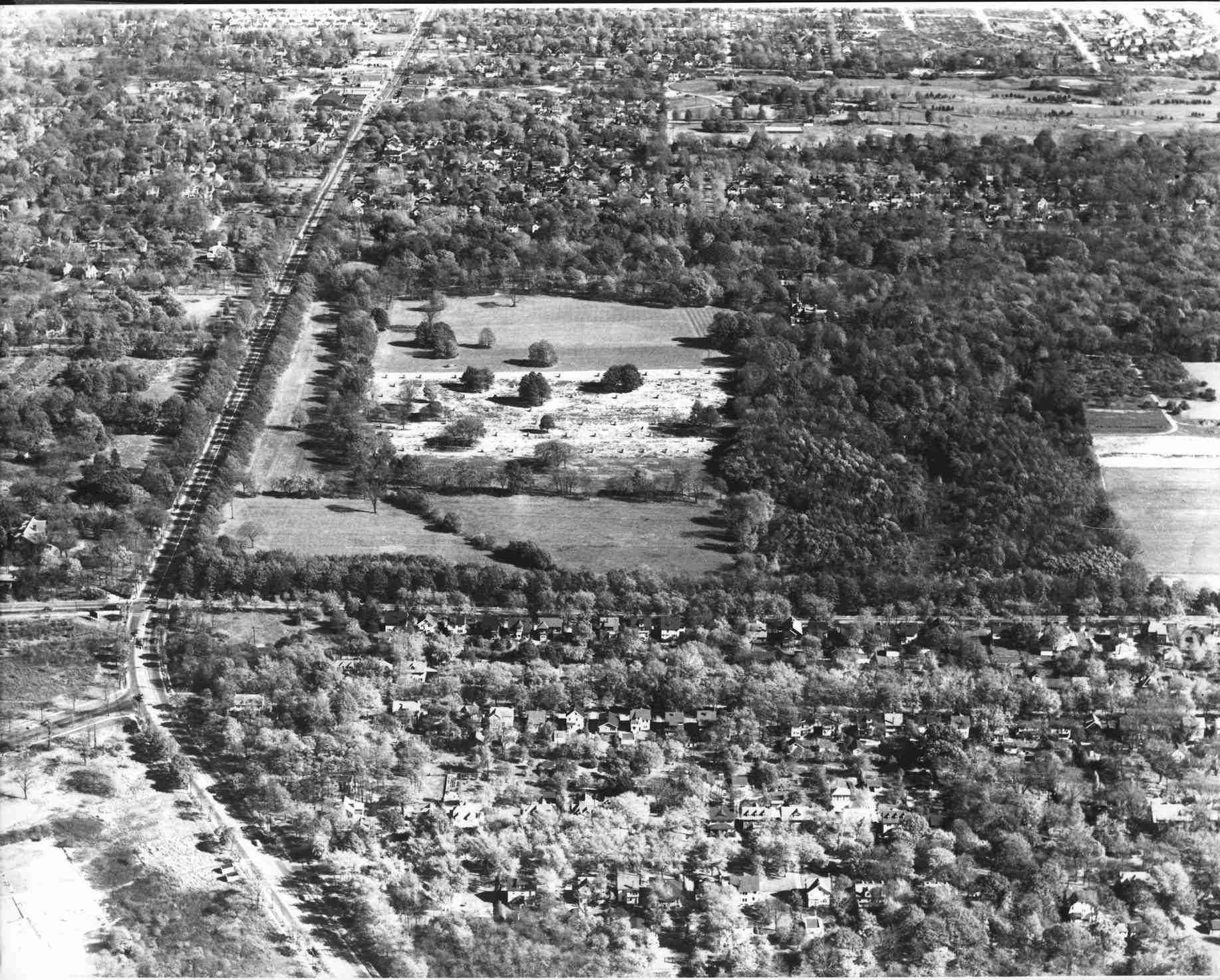 This aerial photograph from 1949 looks eastward from the intersection of Mayfield and Taylor Roads, which is near the bottom left corner of the image. The Longwood Estate is the open stretch of land to the south of Mayfield Road. This land became the site of the Severance Center mall. The Longwood mansion (razed in 1961) can be seen just to the right of the center of the image.