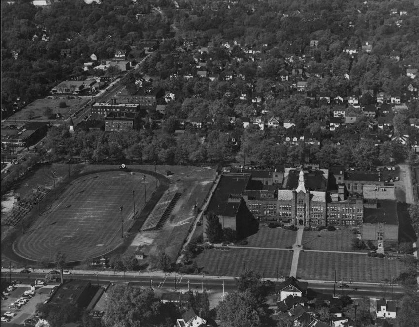 Cedar Road runs in the foreground of this aerial view of Cleveland Heights High School from 1951. Renovations in the 1970s would alter the school's appearance, adding new sections along Cedar Road in front of the original 1926 building, where in this image there is only a lawn. | Source: Cleveland Heights Historical SocietyDownload Original File