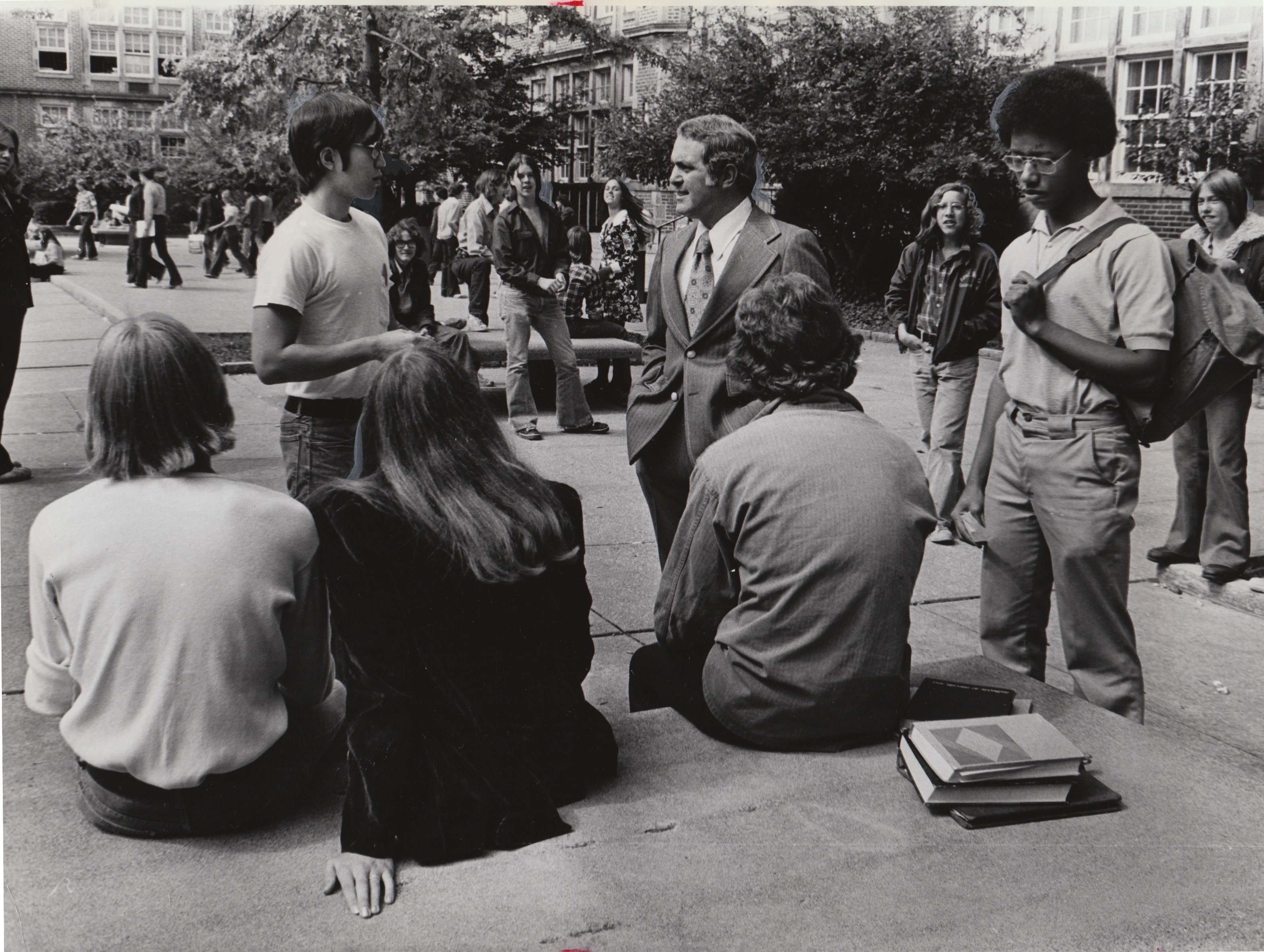 Courtyard, 1975 ID: 1779 | This file appears in: Cleveland Heights High School A student speaks with a member of the faculty in the courtyard at Heights High in 1975. | Source: Cleveland State University Library Special Collections Download Original File SourceCleveland State University Library Special Collections "Courtyard, 1975" appears in: Cleveland Heights High School