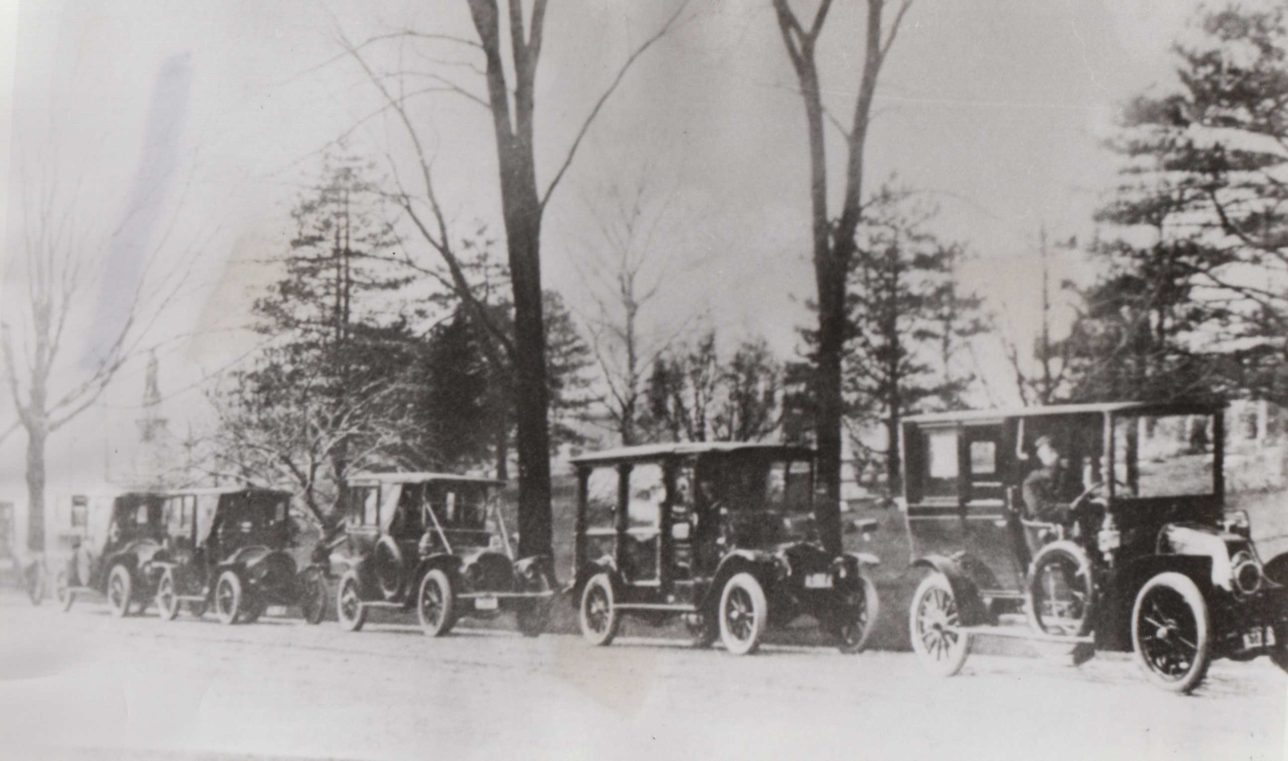 This photograph shows the first funeral procession in Lake View Cemetery in which automobiles (as opposed to horse-drawn carriages) were used. The hearse (second from right) was made from the body of an old horse-drawn hearse which was then placed on an automobile frame made by Cleveland's White Motor Company.
