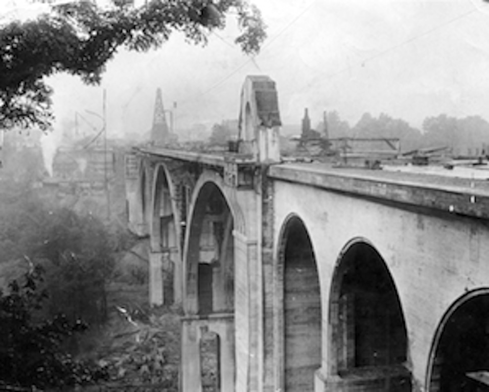 Construction of the Hilliard Road Bridge was finished in 1925. The bridge was built to reduce the traffic on the Detroit Rocky River Bridge as increased suburbanization caused greater traffic in and out of downtown Cleveland. In this photo, construction equipment can be seen on top of the bridge. | Date: 1925 | Source: Cleveland State Library Special CollectionsDownload Original File