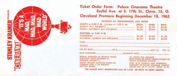 Stanley Kramer's "It's a Mad, Mad, Mad World" was the premiere Cinerama show at the Palace Theater in 1963. Cinerama is the trademarked name for a widescreen process of projecting a movie from three projectors onto a curved screen.